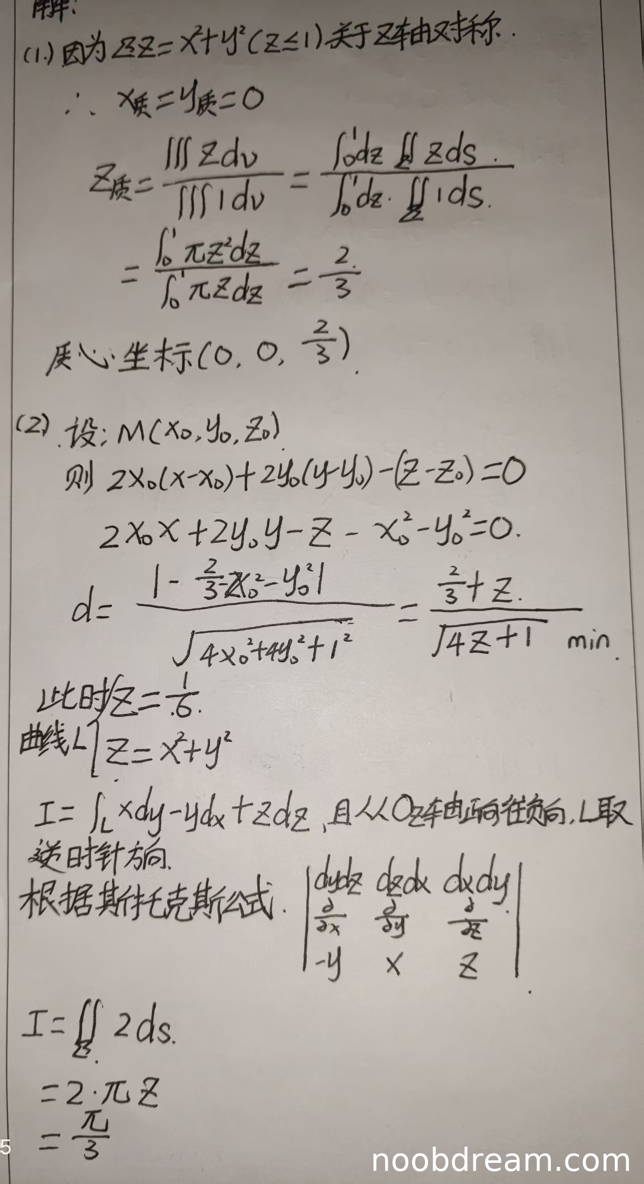 学生正确利用了对称性得出质心的x、y坐标为0,并正确计算了z坐标的积分表达式。计算过程清晰,结果正确。但第一次识别中使用了符号\(\mathrm{d}s\)表示面积微元,应为\(\mathrm{d}x\mathrm{d}y\),不过根据上下文可判断为识别错误或书写习惯,不影响核心逻辑。因此不扣分。