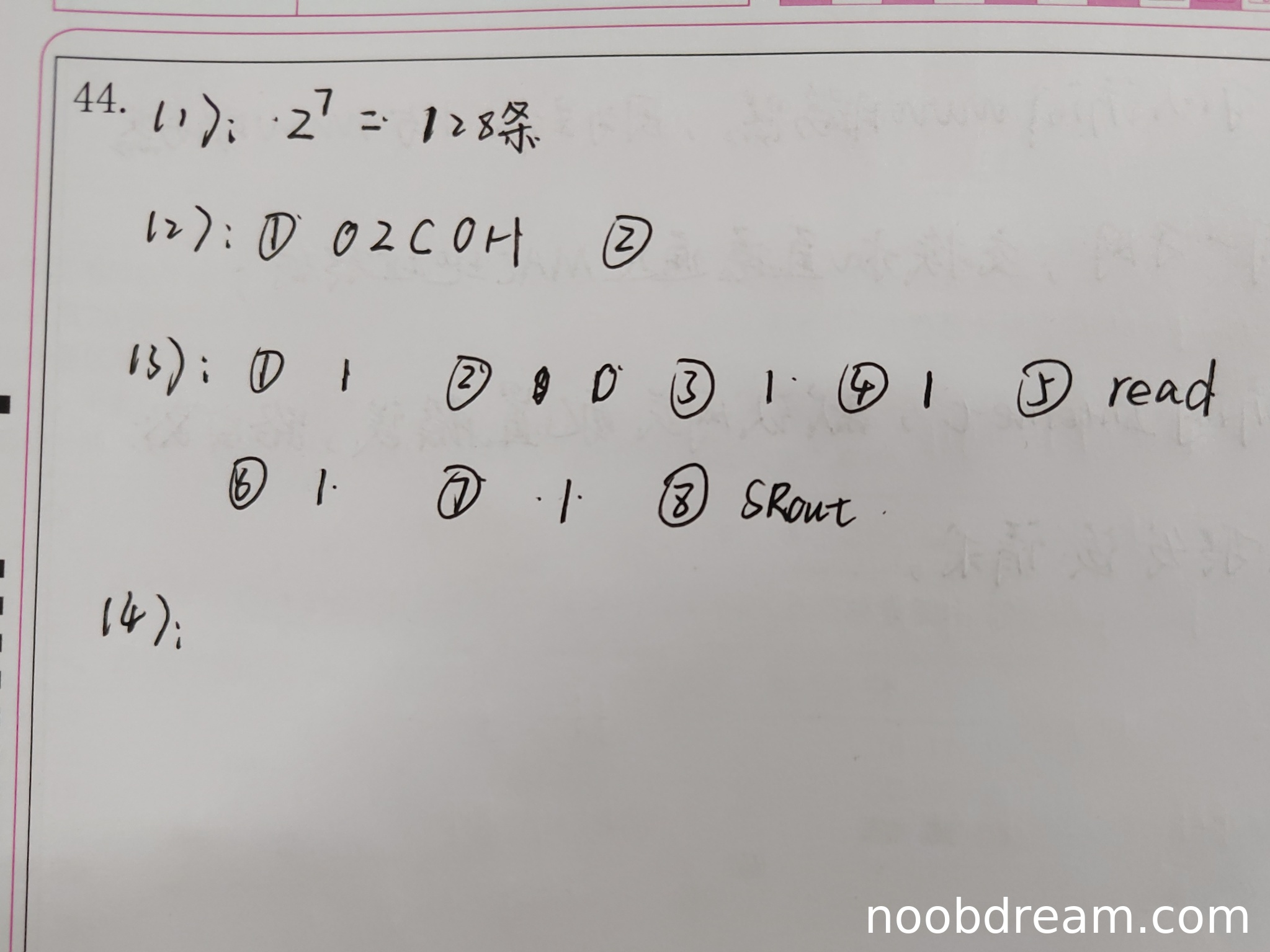 学生答案正确,指出指令操作码有7位,最多可定义128条指令。得1分。