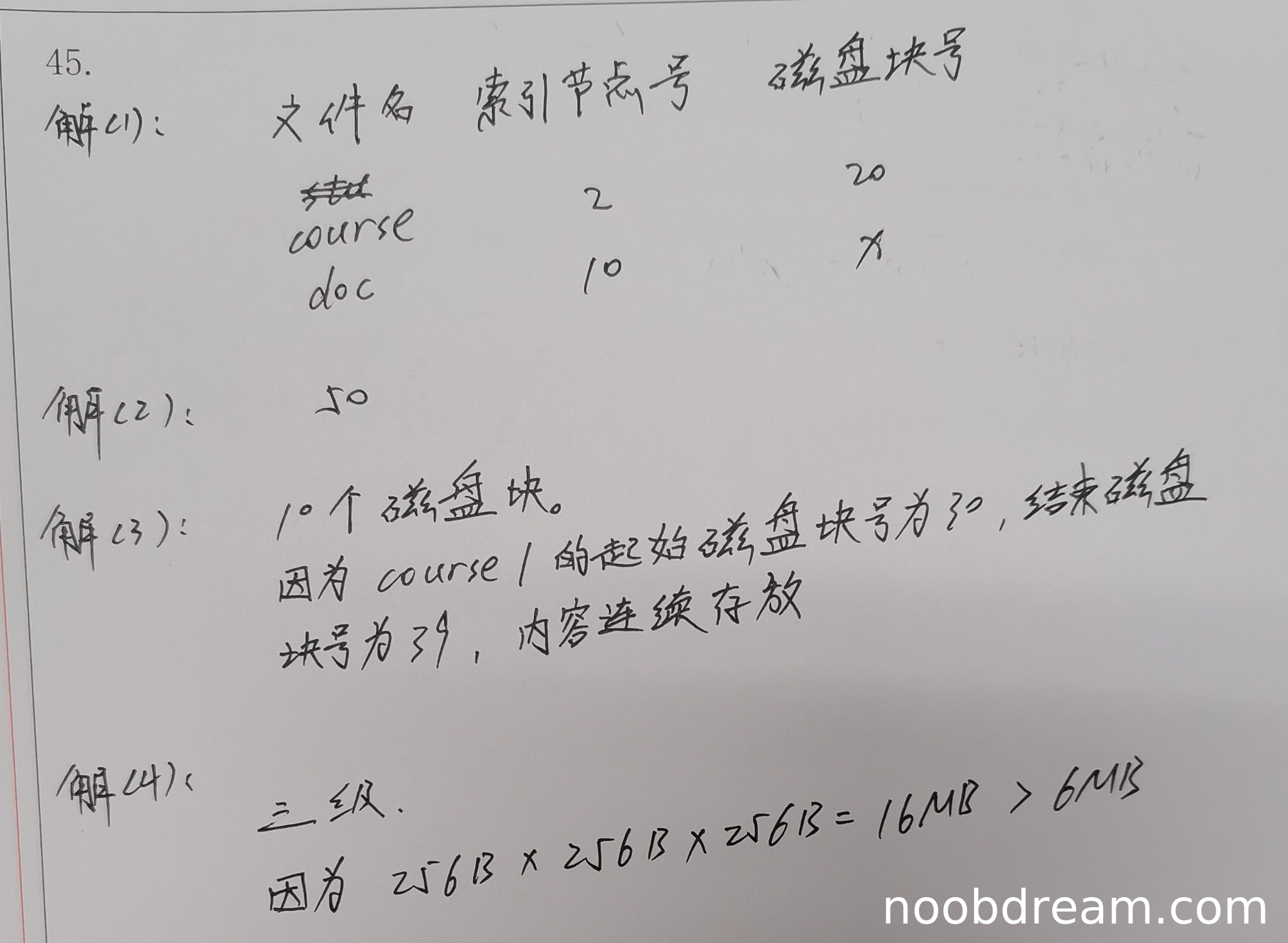 学生两次识别结果均回答x=50,但标准答案为30。根据题目信息,doc与course1共享索引节点(节点号10),因此磁盘块号应相同(30)。答案50明显错误,属于逻辑错误。扣1分。得0分。