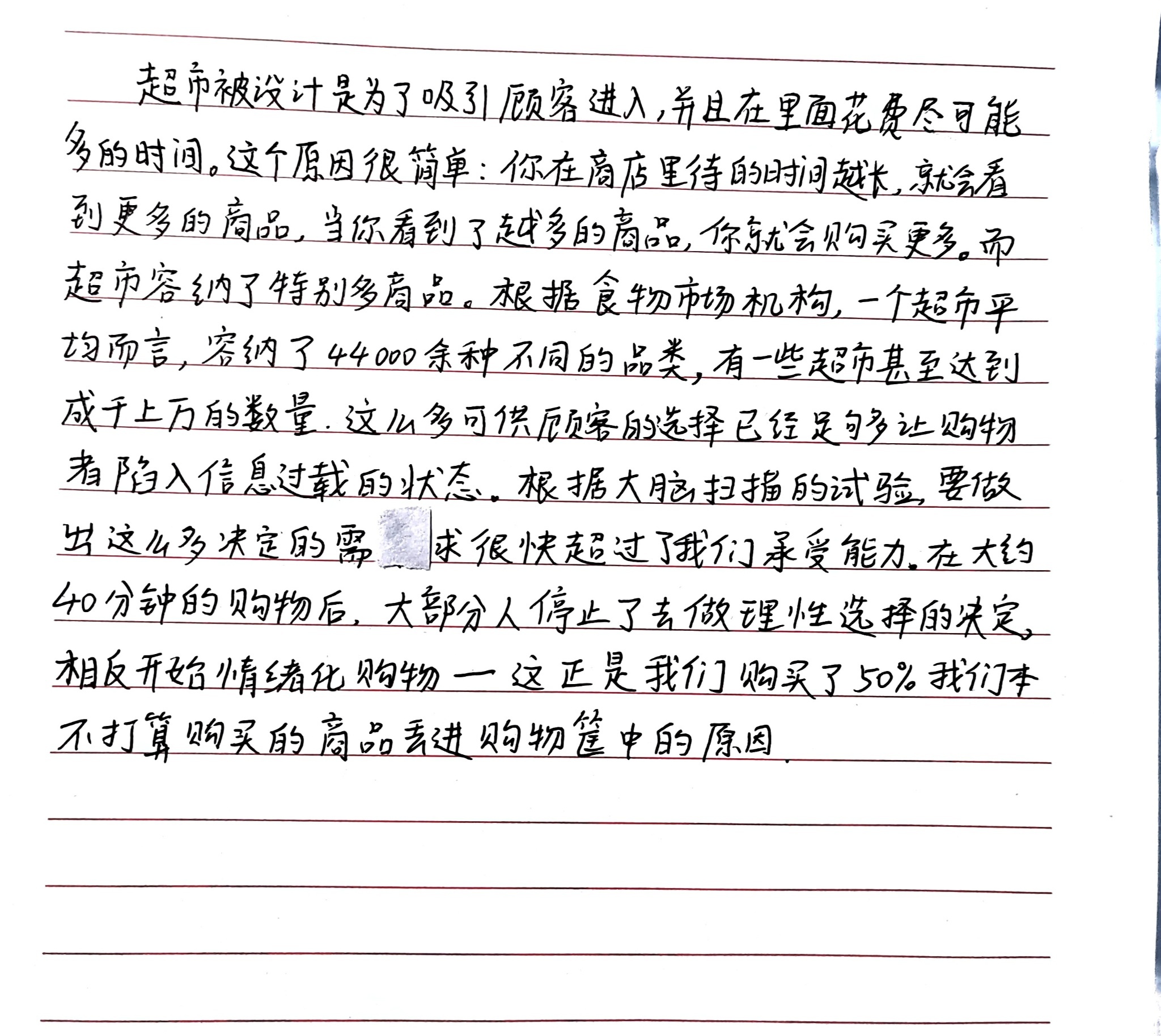 学生翻译整体准确传达了原文意思,语言流畅自然。关键信息点完整:超市设计目的、停留时间与购买量的关系、商品种类数量、信息过载概念、40分钟购物后决策方式转变、冲动购物比例等核心内容都得到正确表达。虽然存在少量表述差异(如"食物市场机构"应为"食品营销研究院","理性选择的决定"稍显冗余),但这些不影响整体理解,属于可接受的翻译变体。根据评分标准,思路正确不扣分,识别错误不扣分,因此给予满分。