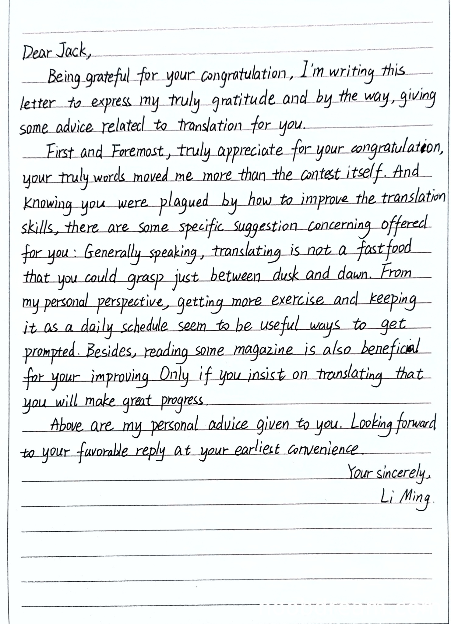 理由:内容基本完整,涵盖了感谢对方祝贺和提供翻译建议两个核心要点。但存在一些次要要点表达不够充分,例如建议部分虽然提到了练习和阅读,但具体性稍显不足。