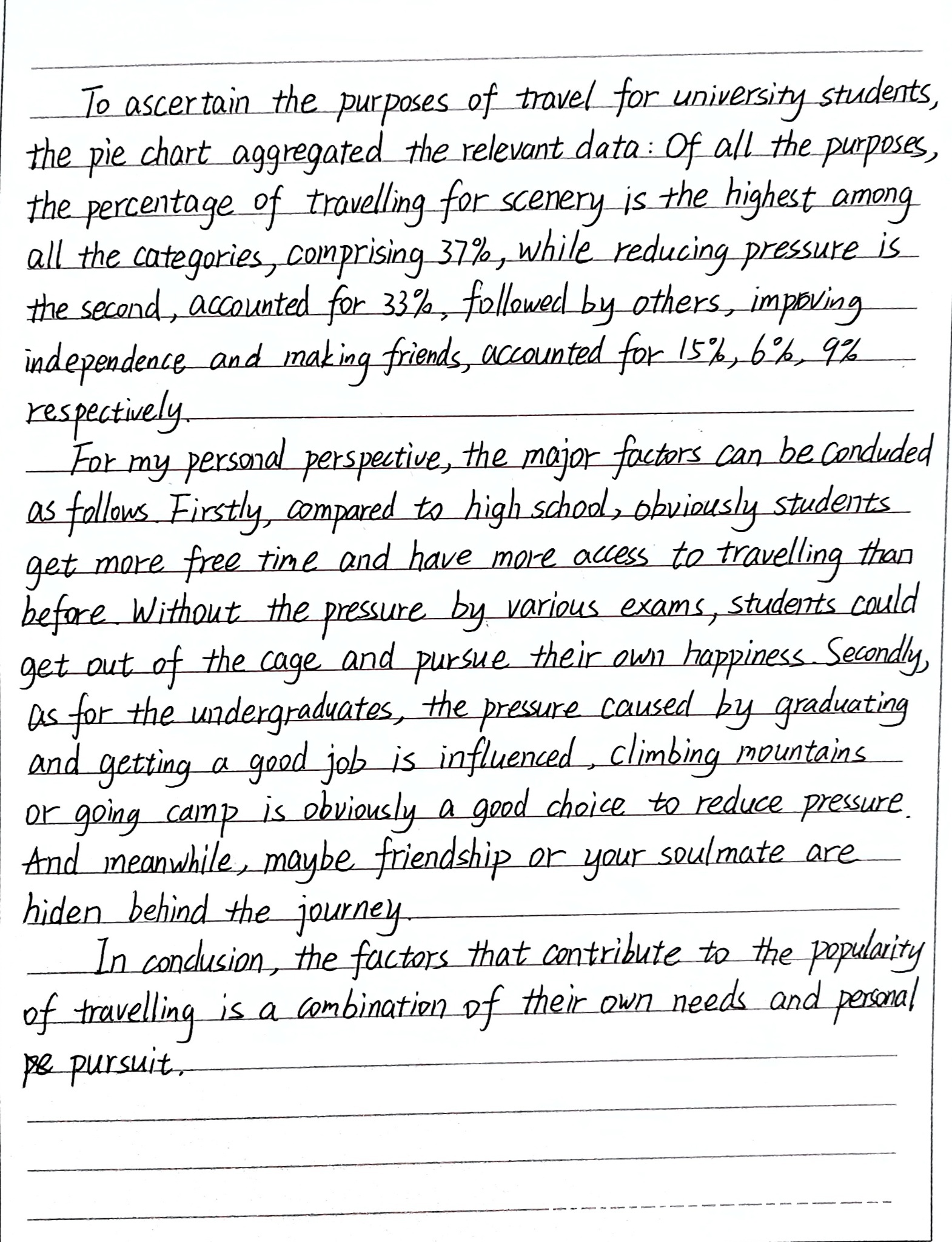 理由:学生较好地完成了图表描述任务,准确呈现了各项数据(欣赏风景37%、缓解压力33%、其他15%、培养独立能力6%、结交朋友9%)。但在原因分析部分,第二个论点"graduating and getting a good job is influenced"表达不够清晰,逻辑稍显混乱,未能充分阐述就业压力与旅行之间的关系。