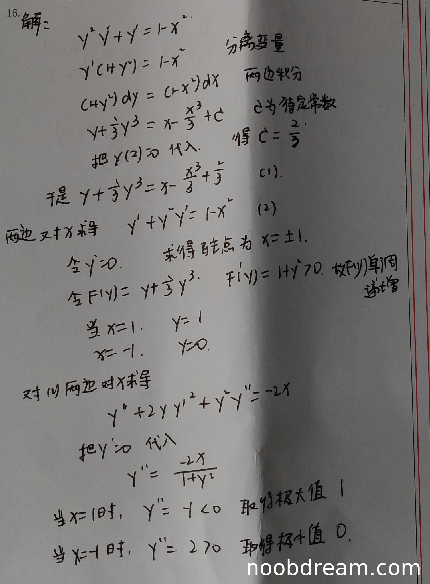 学生通过对隐函数方程两边求导得到 \(y'+y^{2}y'=1-x^{2}\),并令 \(y'=0\) 正确求得驻点 \(x=\pm 1\)。但在第一次识别中,学生写为“令 \(F(y)=y+\frac{1}{3}y^{3}\),\(F'(y)=1+y^{2}>0\),故 \(F(y)\) 单调递增”,此步骤虽正确但与求驻点无直接逻辑关系,属于冗余内容,不影响得分。此部分得3分。