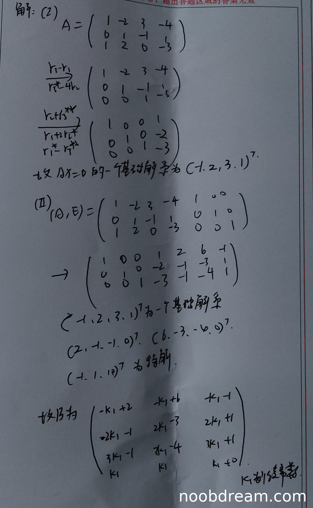 学生作答中给出了正确的基础解系(-1,2,3,1)ᵀ,虽然初等行变换过程表述不够规范(如r₁-r₃、r₃-4r₁等符号使用不规范),但最终得到了与标准答案相同的行最简形矩阵,并得出了正确的基础解系。考虑到核心结果正确,给4分(扣1分是因为变换过程表述不规范)。