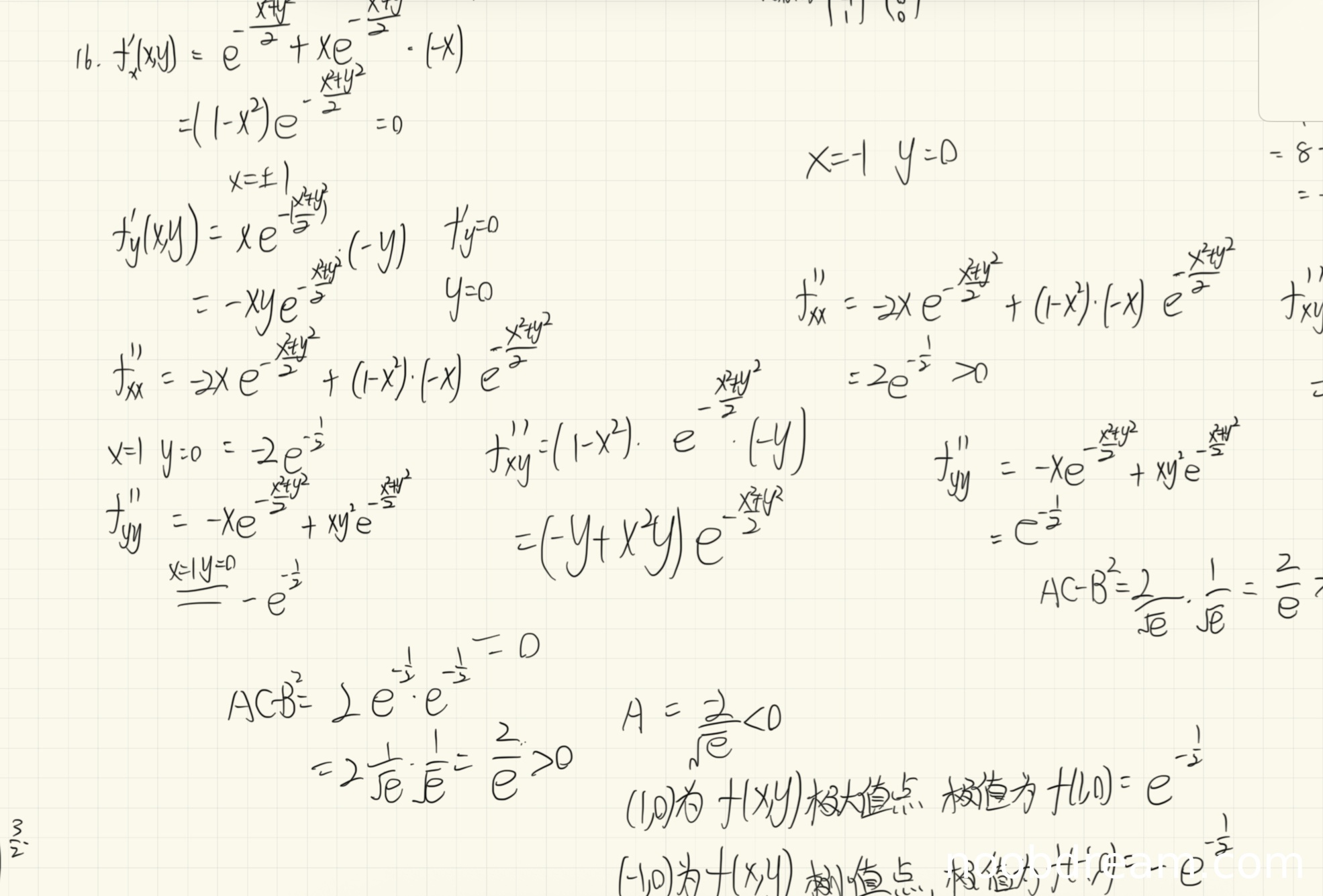 学生作答整体思路正确,按照求多元函数极值的标准步骤进行:先求一阶偏导数并解出驻点,再求二阶偏导数构造Hessian矩阵判别式判断极值类型。具体分析如下: