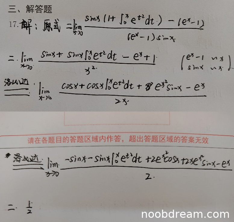然而,在第二次洛必达法则后,分子求导结果中出现了 \(2x e^{x^2} \sin x\) 项,该项在 \(x \to 0\) 时为0,不影响最终结果,但学生在第一次识别结果中写为 \(2x e^{x^2} \sin x\),第二次识别结果中写为 \(2x e^{x^2} \sin x\),均为正确形式(标准答案中未出现此项,但学生计算中保留此项并正确得出极限为0)。整体逻辑正确,计算无误。