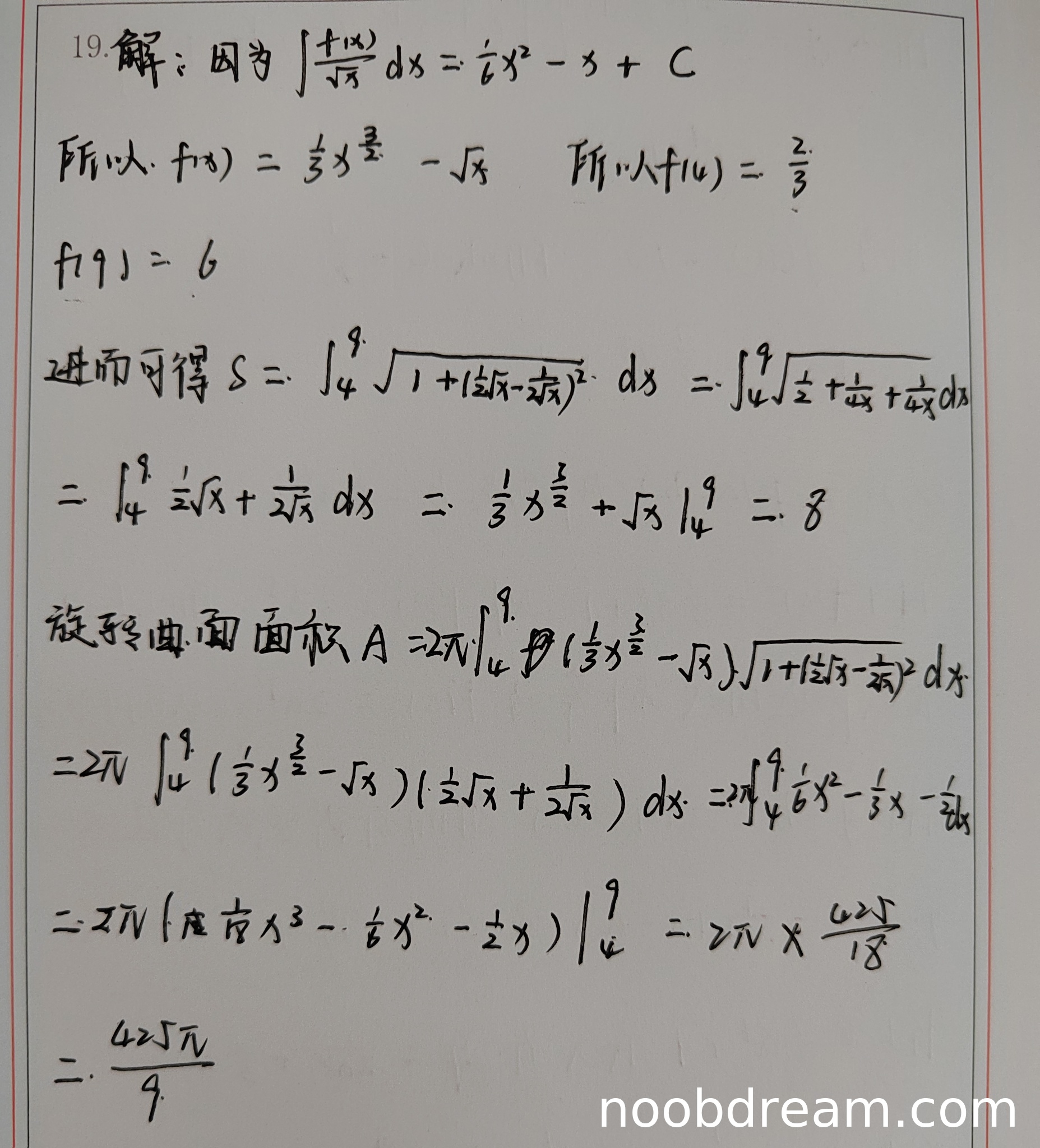 学生写出了正确的旋转曲面面积公式A = 2π∫y√[1+(y')²]dx。在计算过程中,被积函数化简正确为(1/6)x² - (1/3)x - 1/2,积分计算过程正确,最终结果425π/9正确。虽然第二次识别中公式多写了一个"y",但根据上下文判断为识别错误,不扣分。因此A部分得6分。