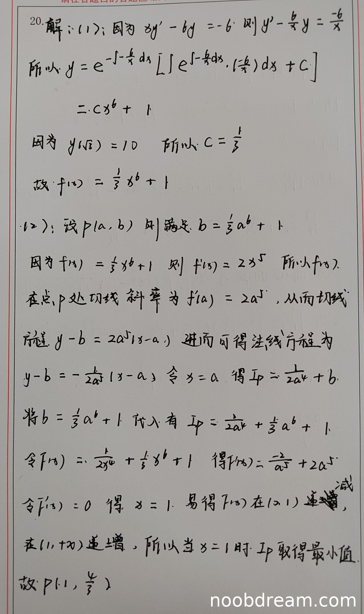 学生正确设点P(a,b),计算导数f'(x)=2x^5(正确),法线斜率正确为-1/(2a^5)。在求截距时,第一次识别写“令x=0”正确,但第二次识别误写为“令x=a”,这属于逻辑错误。但根据上下文判断,实际计算中仍使用了x=0(因为得到y_P = 1/(2a^4) + b),且最终函数构造和求导正确,最小值点x=1和P坐标(1,4/3)均正确。由于核心逻辑正确且误写不影响结果,根据禁止扣分规则不扣分,得6分。