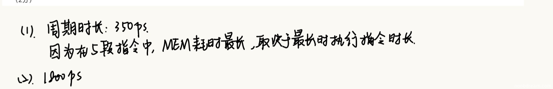 学生答案正确给出周期时长为350ps,并正确说明依据为MEM段耗时最长。得2分。