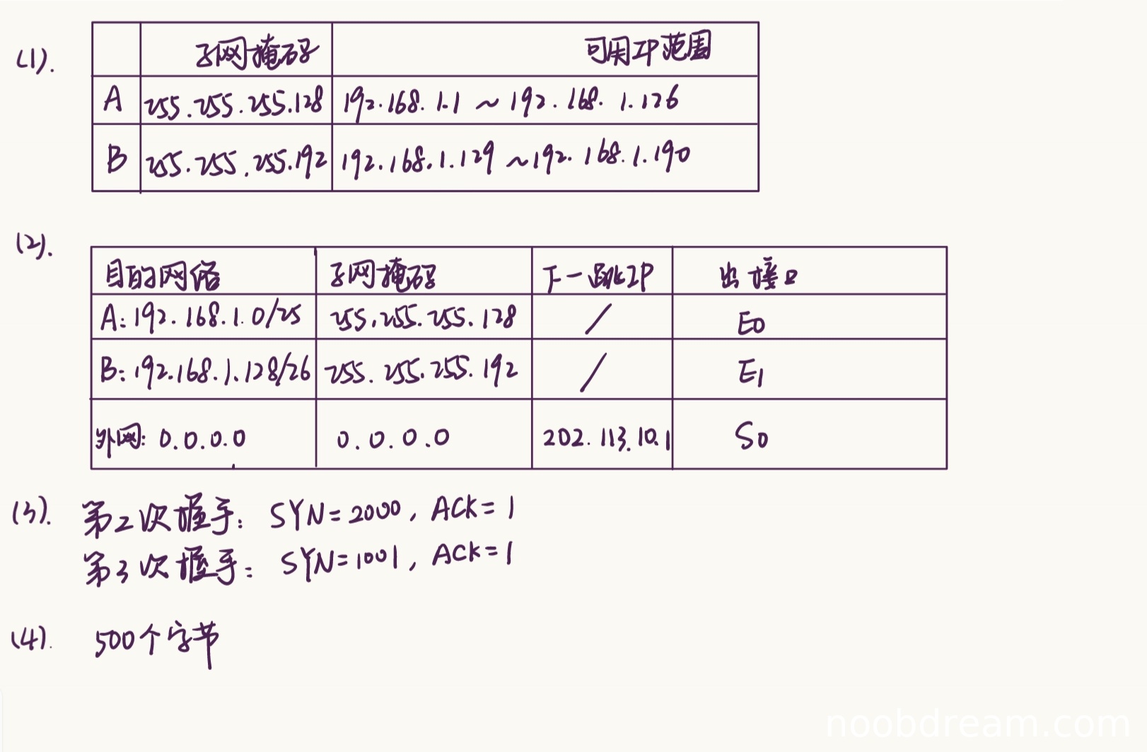学生答案正确给出了部门A和部门B的子网掩码和可用IP范围,与标准答案完全一致。部门A子网掩码为255.255.255.128,可用IP范围192.168.1.1-192.168.1.126;部门B子网掩码为255.255.255.192,可用IP范围192.168.1.129-192.168.1.190。得3分。