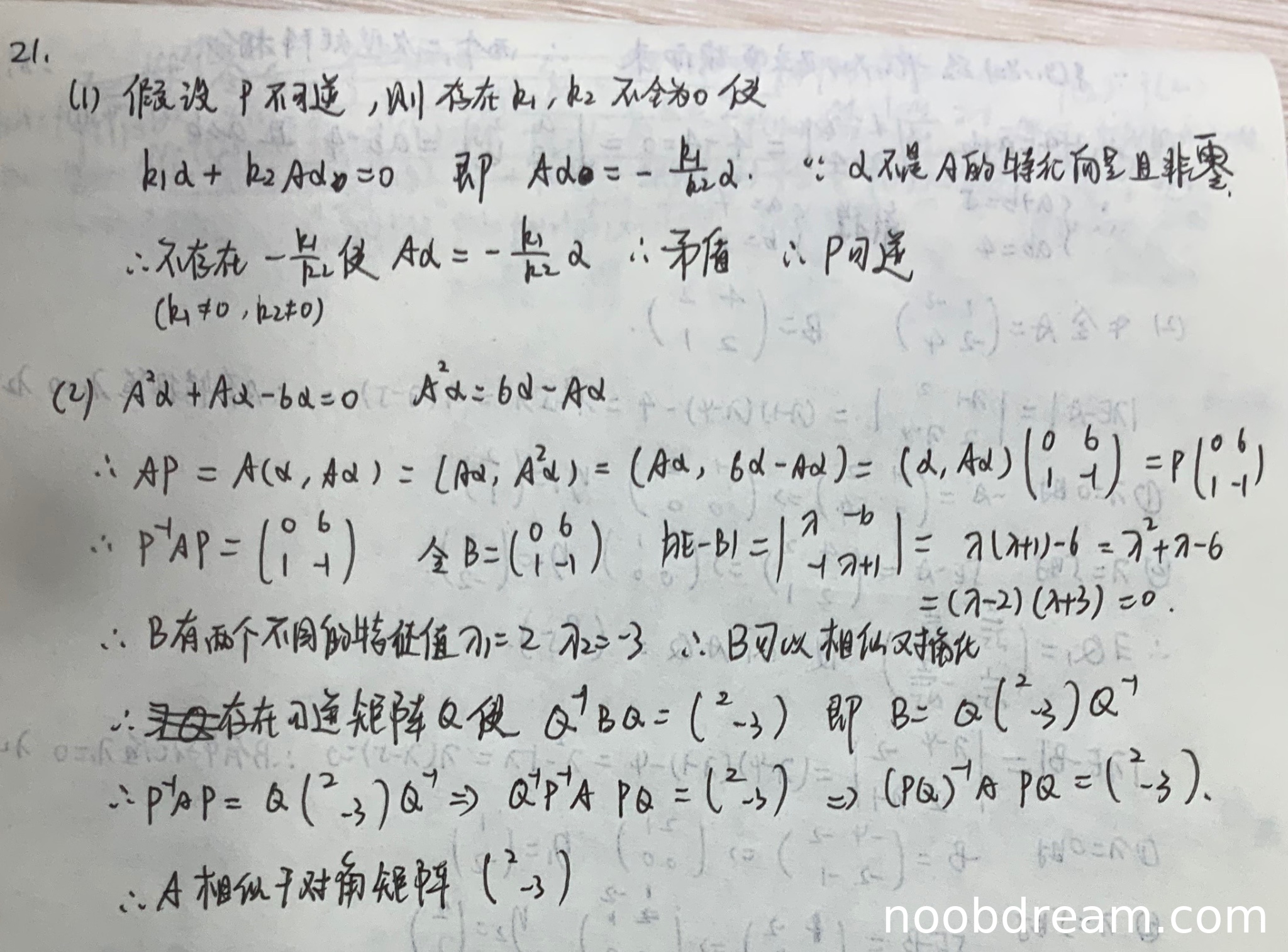 学生作答的第一次识别和第二次识别在(I)部分思路与标准答案法1一致:假设P不可逆,则α与Aα线性相关,推出Aα是α的倍数,与α不是特征向量矛盾。论证逻辑完整。但在第一次识别中写有“(k₁≠0,k₂≠0)”的额外说明,这不影响核心逻辑。因此给满分5分。