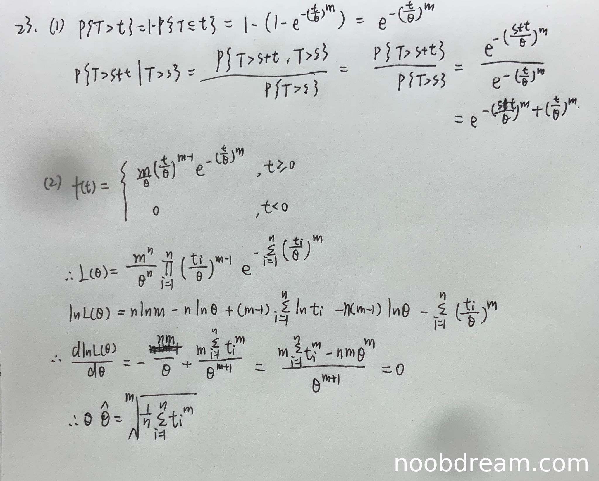 - 概率密度函数 \(f(t)\):学生正确给出 \(f(t) = \frac{m}{\theta}(\frac{t}{\theta})^{m-1}e^{-(\frac{t}{\theta})^m}\)(与标准答案等价),得满分部分(通常占该问的1/4分值,即1.375分)。