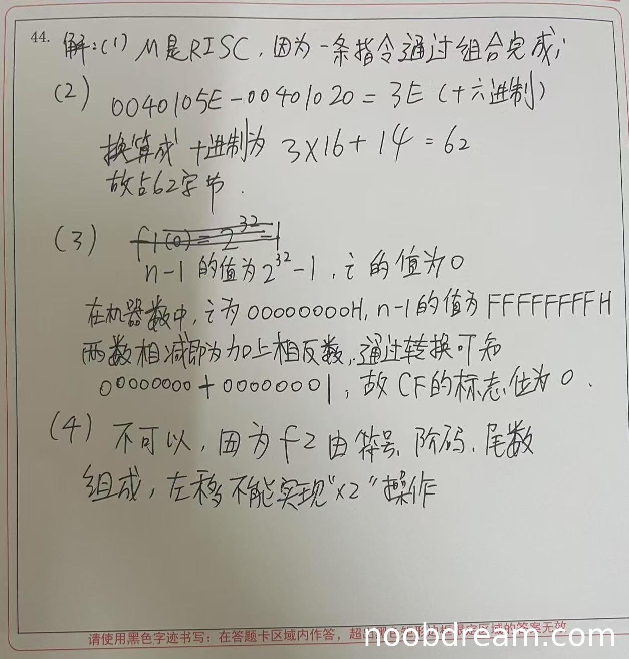 学生正确识别了i=00000000H,n-1=FFFFFFFFH,也理解了两数相减是加上相反数的原理。但在计算过程中得出CF=0的结论是错误的,标准答案应该是CF=1。学生对补码减法中借位标志的计算理解有误。考虑到学生理解了基本计算原理,但最终结果错误,给予1分。