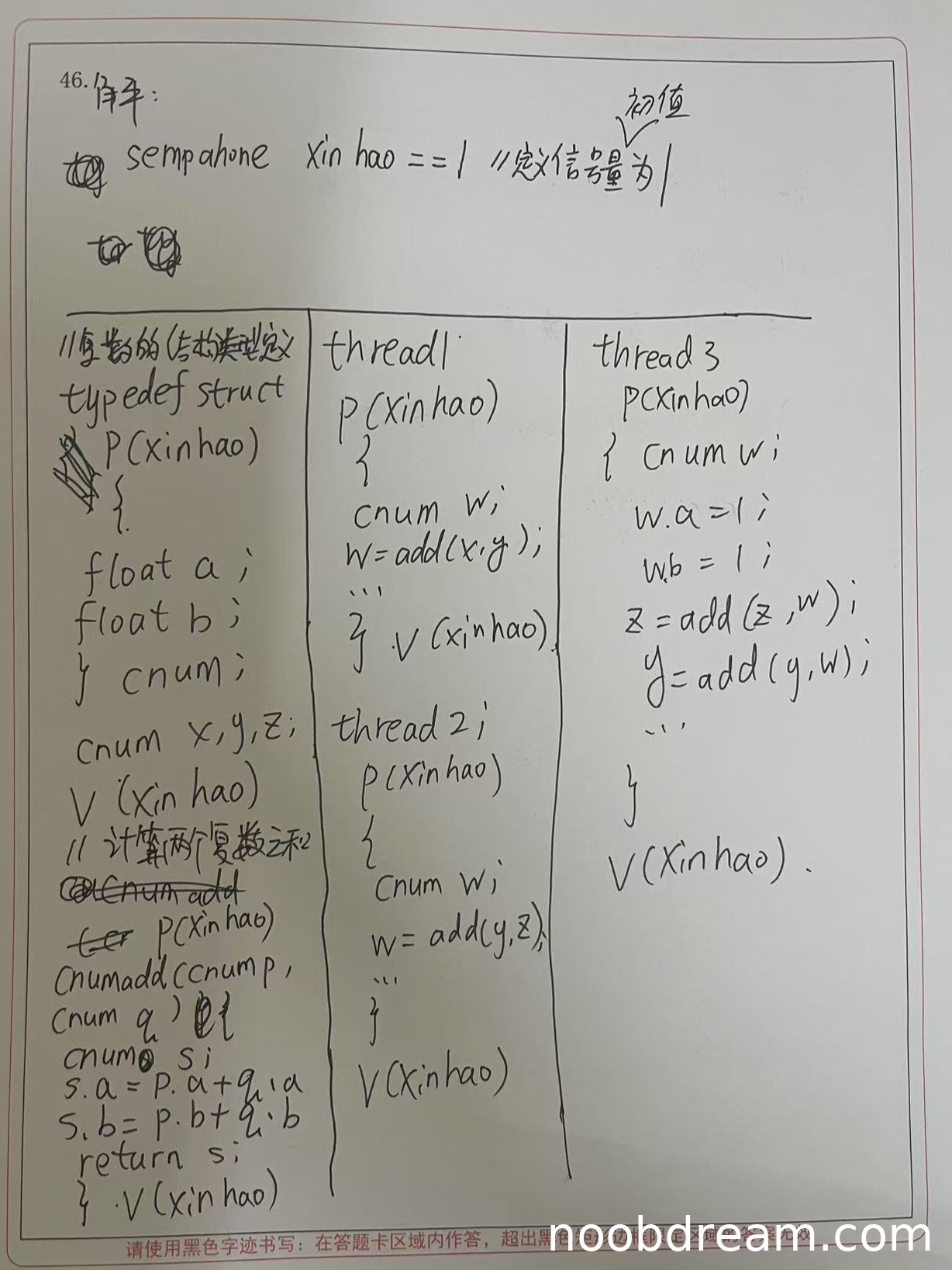 thread1中正确使用了P、V操作保护了对共享变量x、y的访问,虽然使用的是全局锁而非细粒度锁,但逻辑正确。给1.5分。