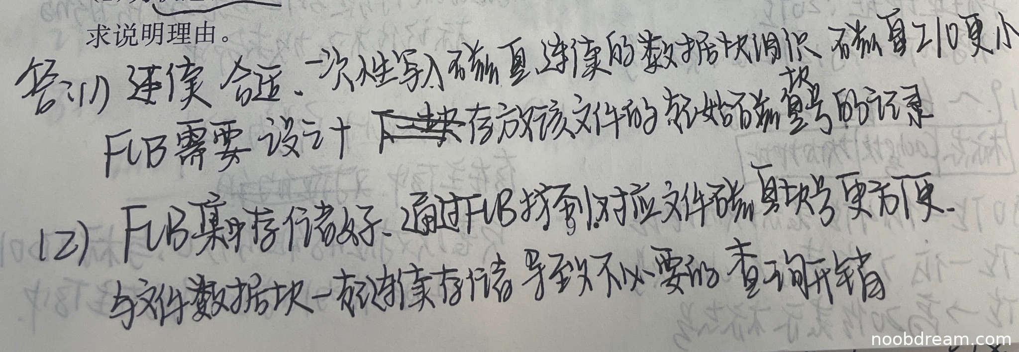 学生第一问选择了"连续"文件组织方式,理由基本正确(一次性写入、连续数据块调用次数更小),但表述不够完整(未明确提及无扩展问题、空间开销小、读取速度快等关键点)。第二问中,学生提到FCB需要存放"起始扇区号",这相当于起始块号,但未提及块数或结束块号,描述不完整。此外,学生将FCB误写为"FUB",但根据上下文判断为识别错误,不扣分。综合来看,第一问得2分(选择正确得1分,理由部分正确得1分),第二问得1分(部分正确描述起始块号)。本小题总计得分3分。