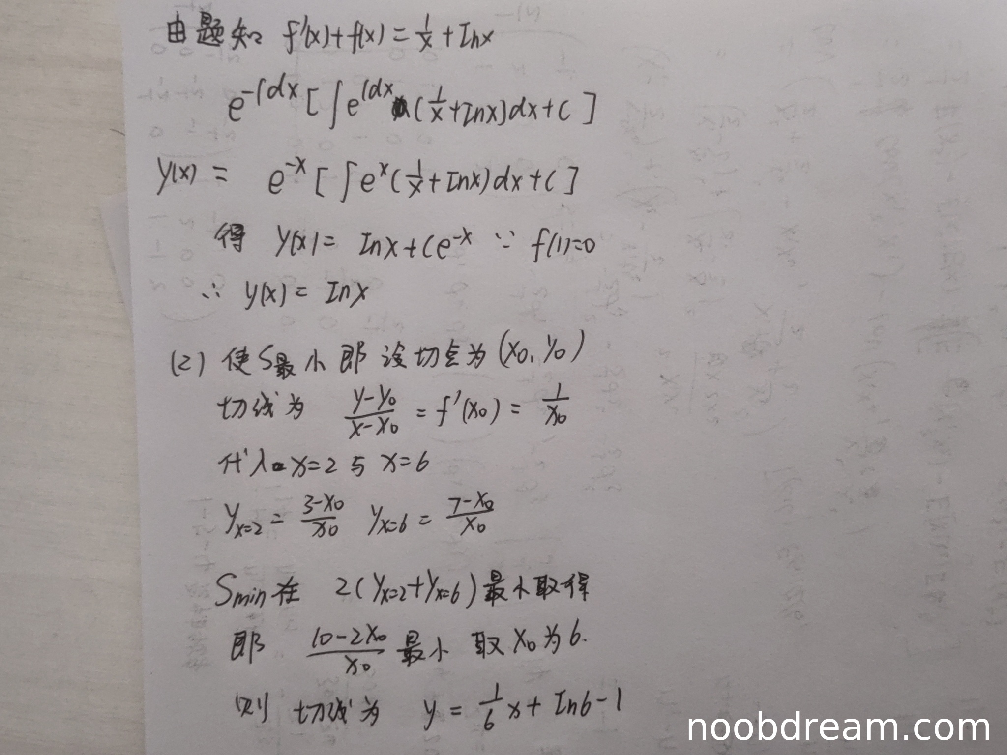 学生正确设切点为 \( (x_0, y_0) \),并写出切线方程 \( y = \frac{1}{x_0}x + \ln x_0 - 1 \)。但在计算面积时,错误地将面积表示为 \( 2(y_{x=2} + y_{x=6}) \) 的形式,这不符合面积的实际定义(应为被积函数在区间上的积分)。此外,学生错误地认为该表达式的最小值对应面积最小,并得出 \( x_0 = 6 \) 的结论,而标准答案中正确面积函数为 \( A(\xi) = \frac{16}{\xi} + 4\ln \xi - 4 - \int_2^6 \ln x \, dx \),通过求导得 \( \xi = 4 \)。由于面积计算逻辑错误,导致最终切线方程错误。因此,本小题扣3分,得2分。