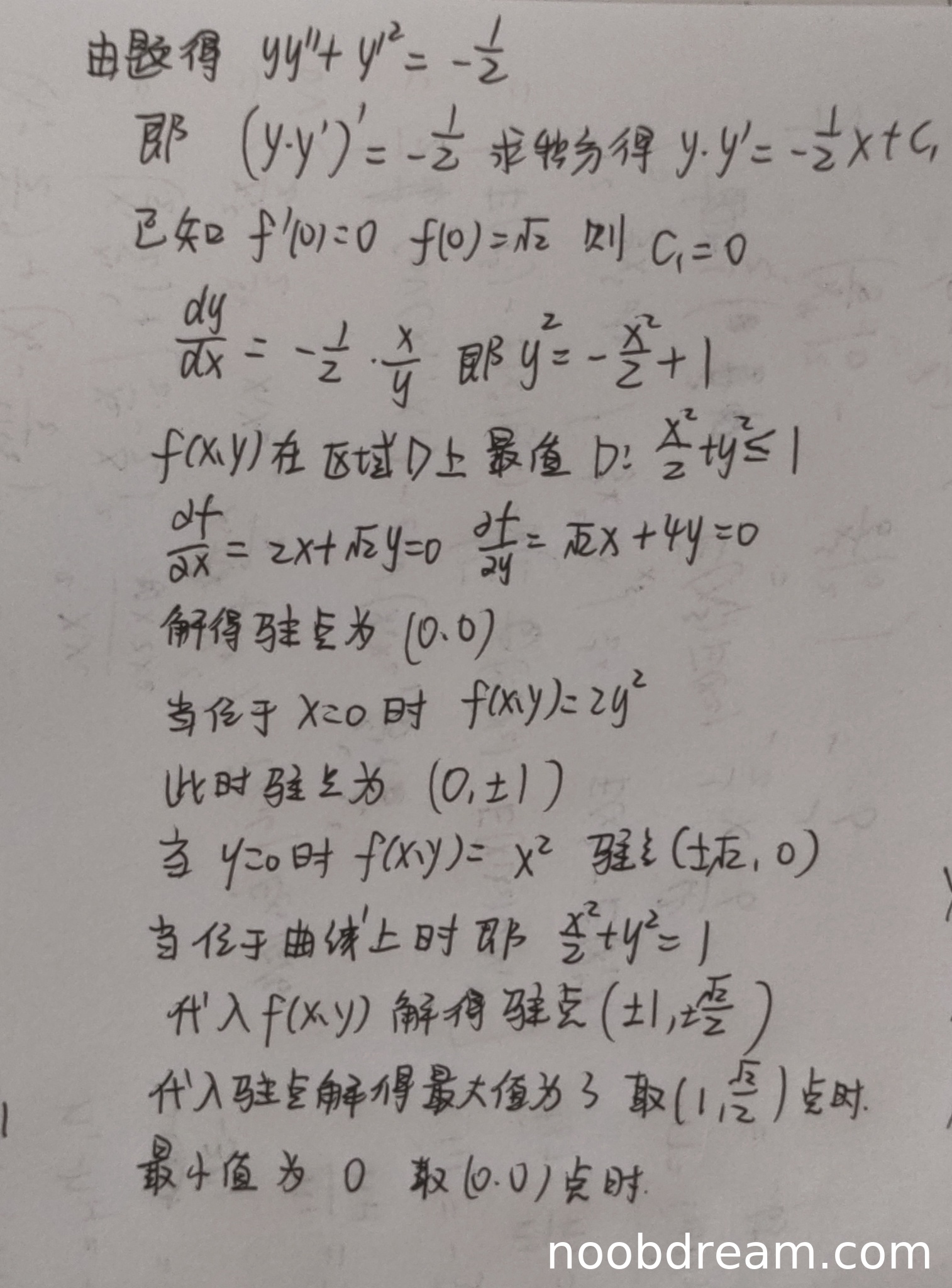 学生正确识别了微分方程并变形为$(yy')' = -\frac{1}{2}$,积分得到$yy' = -\frac{1}{2}x + C_1$,利用初始条件$y'(0)=0$确定$C_1=0$。但在分离变量积分时出现错误:从$y dy = -\frac{1}{2}x dx$积分应得$\frac{1}{2}y^2 = -\frac{1}{4}x^2 + C_2$,但学生得到$y^2 = -\frac{x^2}{2}+1$,这相当于$C_2=1$,而正确值应为$C_2=2$(由$y(0)=\sqrt{2}$得$y^2(0)=2$)。因此曲线方程错误,导致后续区域判断错误。扣2分。