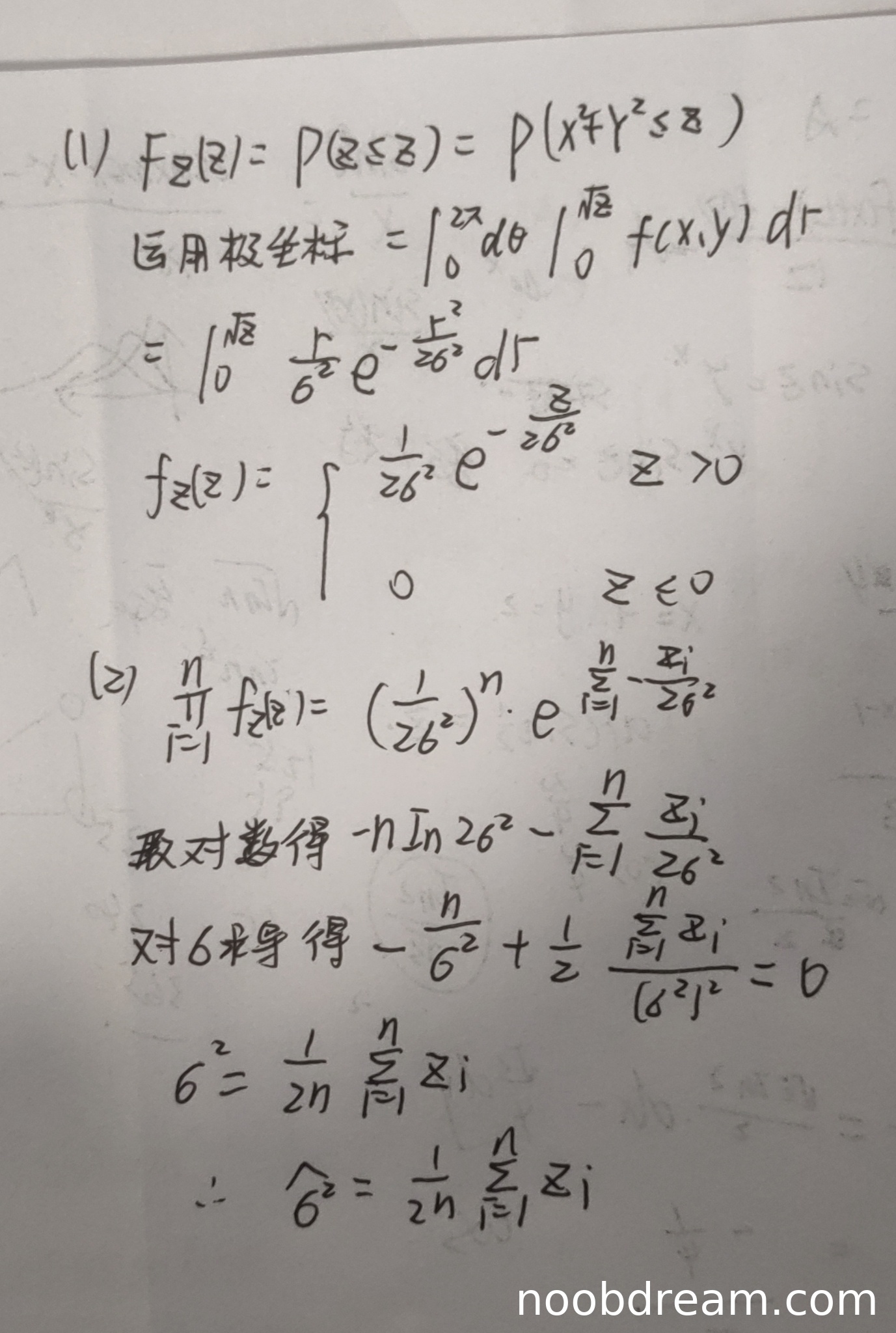 第一次识别结果中,由于识别错误,将σ误写为6,导致概率密度函数表达式错误(如f_Z(z)中分母出现26²而非2σ²),但分布函数推导过程正确。第二次识别结果中,所有符号正确,分布函数推导和概率密度函数结果均正确,且给出了EZ=2σ²(虽然没有显式写出,但通过分布类型可推断)。根据禁止扣分规则第1、2、3条,第一次识别中的误写不扣分,以第二次识别为准。因此本小题得满分6分。