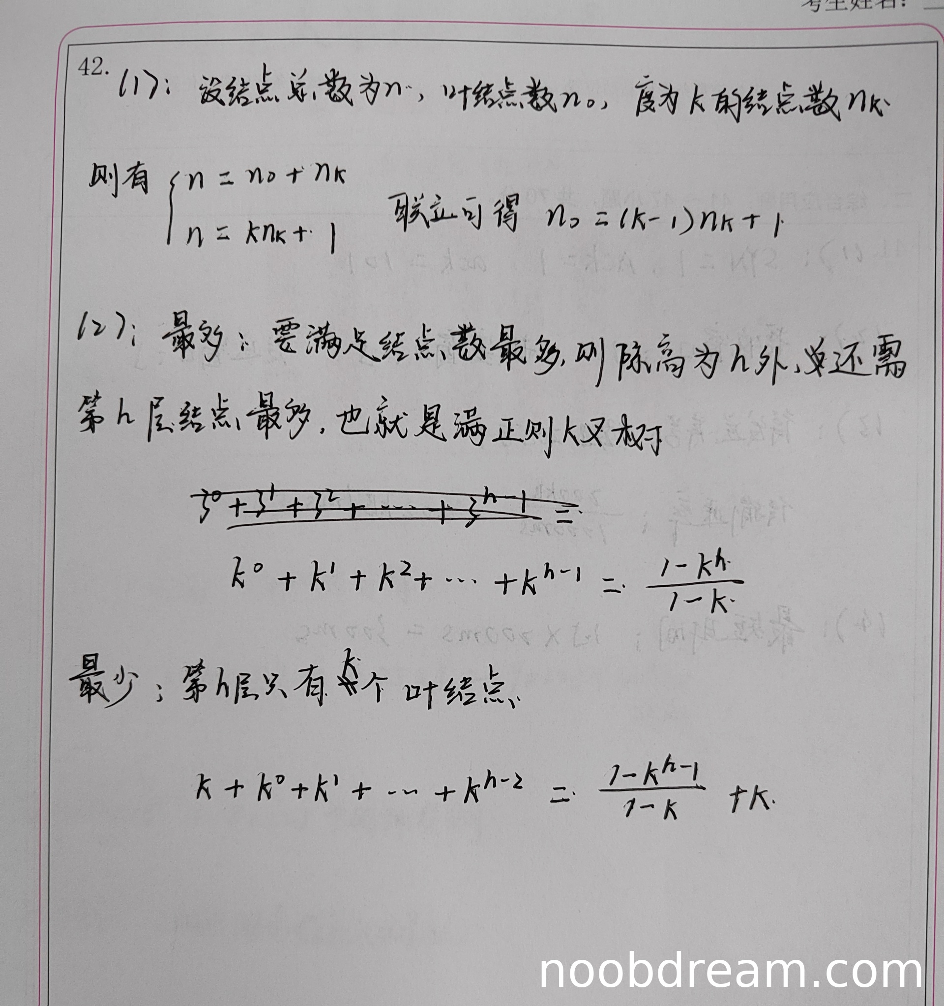 对于最多结点情况:学生正确识别出满正则k叉树的情况,给出了等比数列求和公式 k⁰ + k¹ + ... + kʰ⁻¹ = (1-kʰ)/(1-k),这与标准答案等价(标准答案为(kʰ-1)/(k-1)),只是分子符号不同但数学上等价,因此这部分正确。
