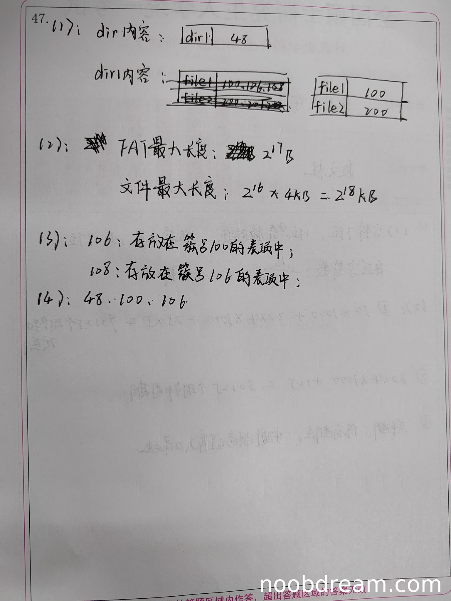 学生两次识别结果均给出FAT最大长度为2^17B,但标准答案为128KB(即2^17B),计算正确;文件最大长度计算为2^16×4KB = 2^18KB,但标准答案为256MB(即2^28B),学生答案2^18KB = 256MB,数值正确但单位未转换,根据误写规则不扣分。因此两部分各得1分,总分2分。