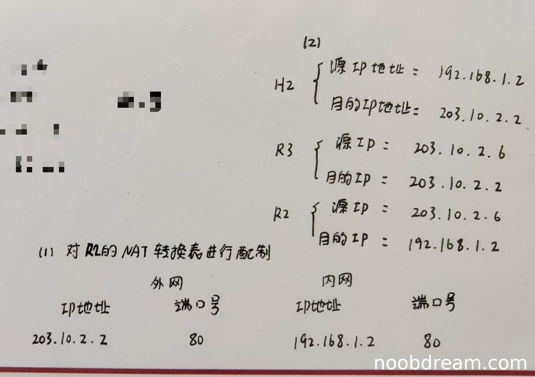 学生答案中提到了对R2的NAT转换表进行配置,并给出了转换表内容。但存在以下问题: