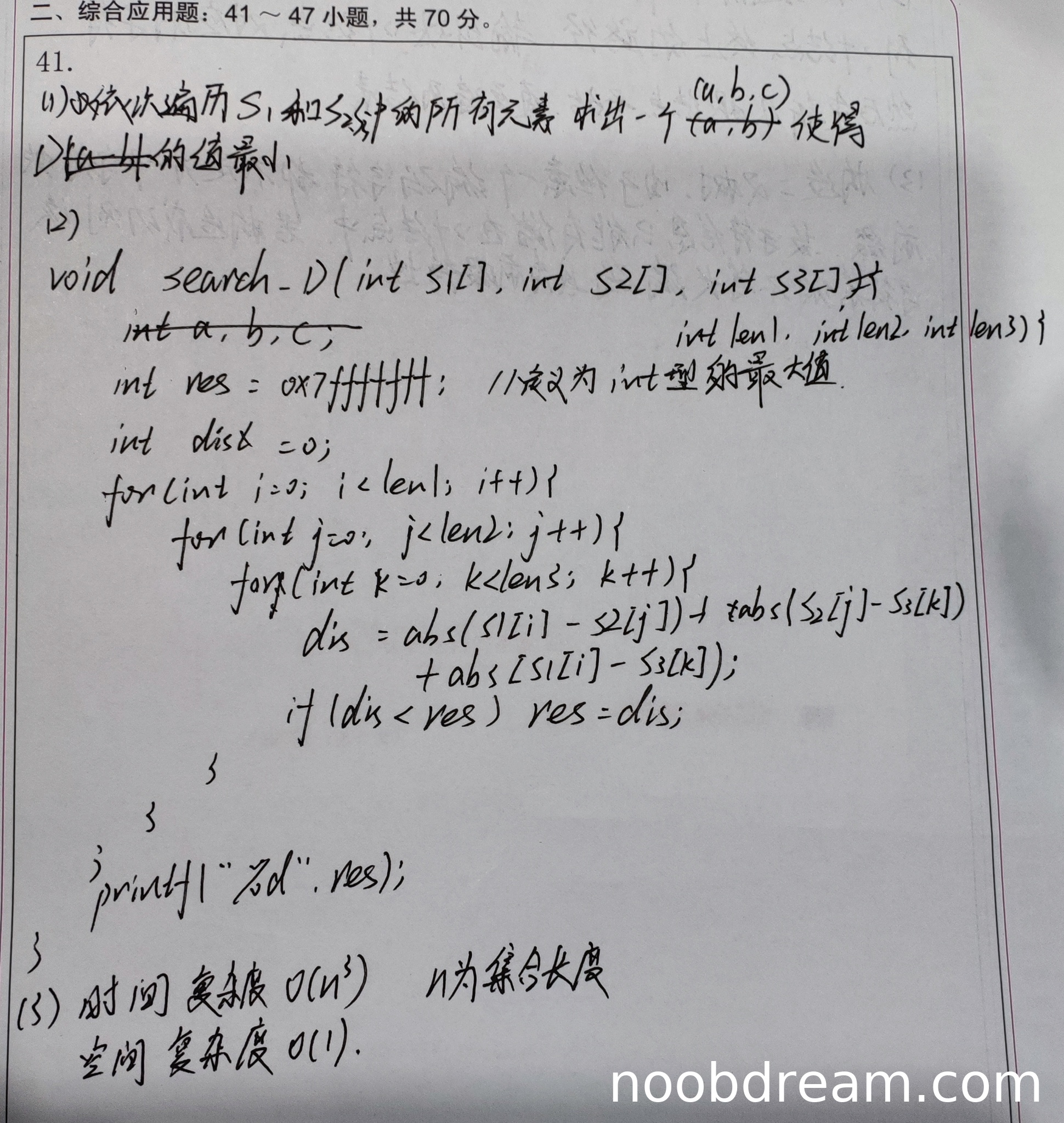 得1分。学生正确识别出时间复杂度为O(n³),但表述"n为综合长度"或"n为集合长度"不够准确,应该是三个集合长度的乘积。空间复杂度O(1)正确。由于时间复杂度表述不够精确,扣1分。