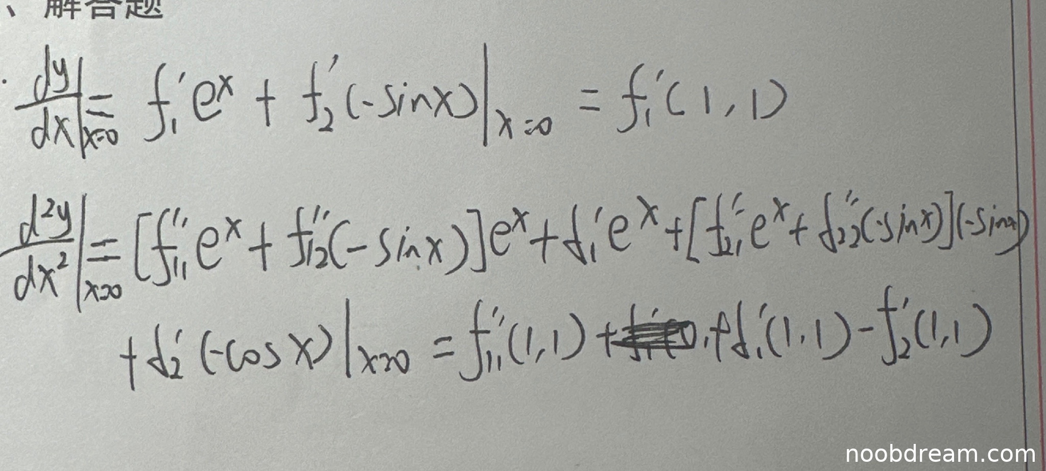 学生在二阶导数计算中,正确对一阶导数表达式再次求导,应用了乘积法则和链式法则,得到: \[ \frac{d^2y}{dx^2} = [f_{11}'' e^x + f_{12}'' (-\sin x)] e^x + f_1' e^x + [f_{21}'' e^x + f_{22}'' (-\sin x)] (-\sin x) + f_2' (-\cos x) \] 代入 \(x=0\) 后得到 \(\left.\frac{d^2y}{dx^2}\right|_{x=0} = f_{11}''(1,1) + f_1'(1,1) - f_2'(1,1)\)。虽然表达式中 \(f_{12}''\) 和 \(f_{21}''\) 项在代入后消失(因为 \(\sin 0 = 0\)),且学生正确利用了 \(f\) 具有二阶连续偏导数的条件(即 \(f_{12}'' = f_{21}''\)),最终结果与标准答案一致。但标准答案中显式写出了所有项,而学生答案在代入前表达式完整,代入后结果正确,因此不扣分。得5分。