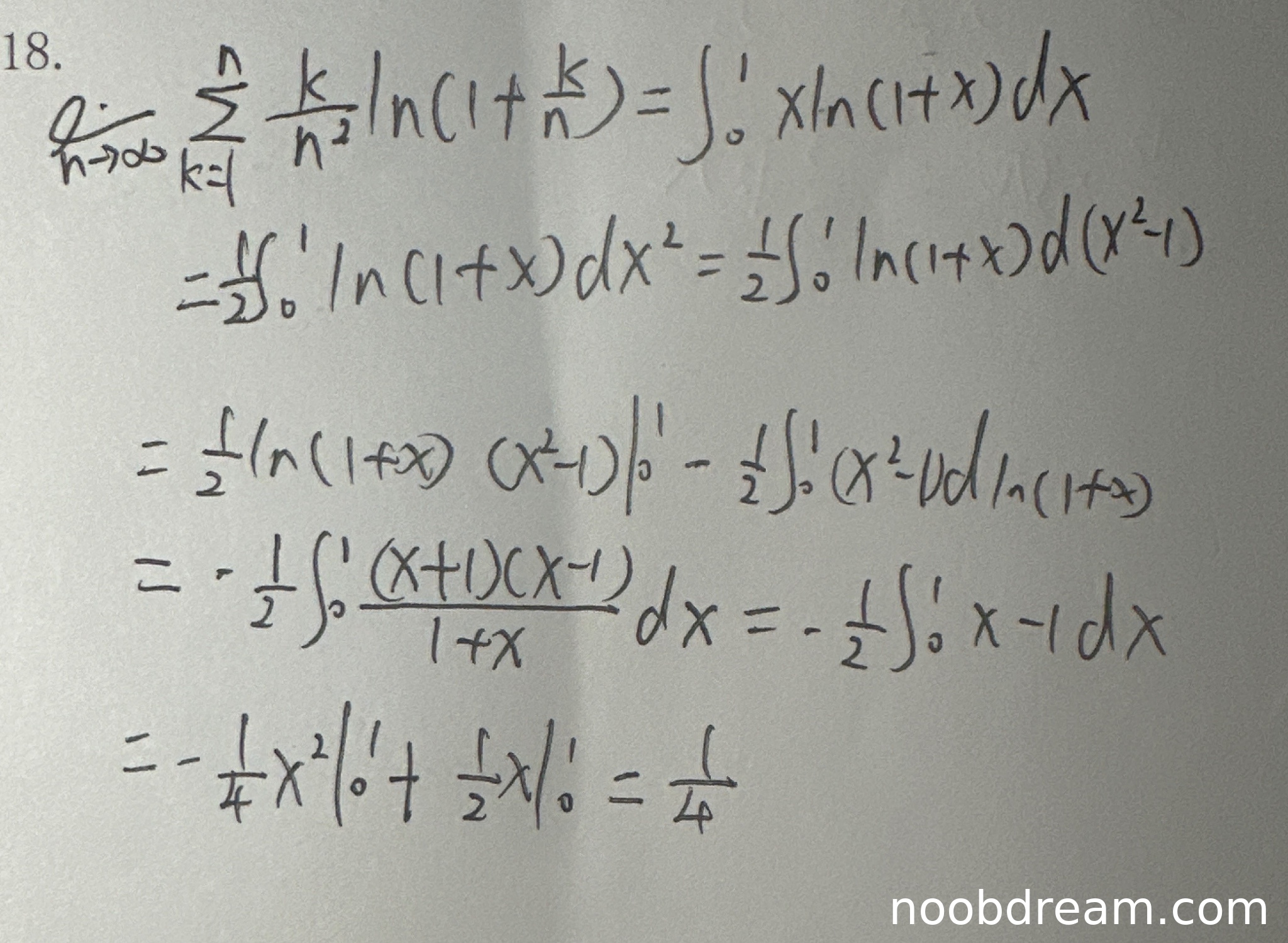 第二次识别结果完整正确:正确将极限转化为定积分 \(\int_{0}^{1} x\ln(1+x)dx\),分部积分过程正确,代数化简准确,最终得到正确答案 \(\frac{1}{4}\)。