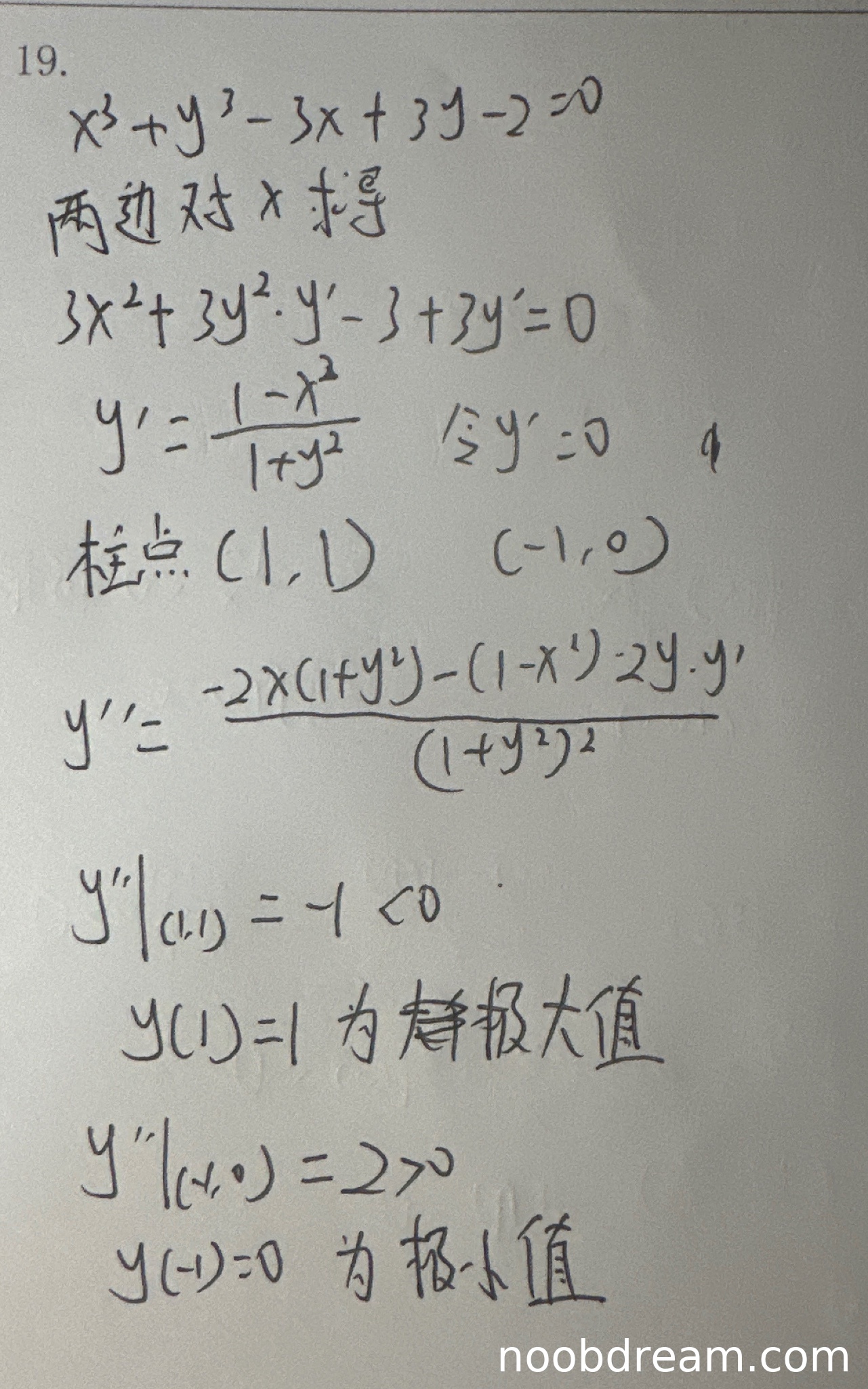 - 正确令 \(y' = 0\) 解得 \(x = \pm 1\),并代入原方程求得对应 \(y\) 值,得到驻点 \((1,1)\) 和 \((-1,0)\)。