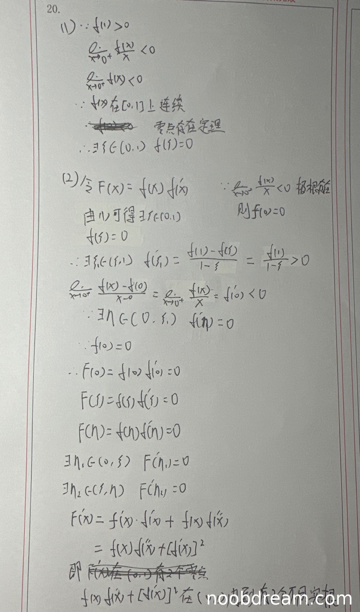 学生正确构造F(x)=f(x)f'(x),并找到三个零点:F(0)=0, F(ξ)=0, F(η)=0。但存在以下问题: 1. 错误假设f(0)=0(题目未直接给出,需证明) 2. 点η的定位混乱(η∈(0,ξ)但后面写η₂∈(ξ,η)) 3. 罗尔定理应用时区间选择错误(应为(0,η₁)和(η₁,η₂)等) 核心思路正确但执行存在逻辑错误,扣2分。得3分。