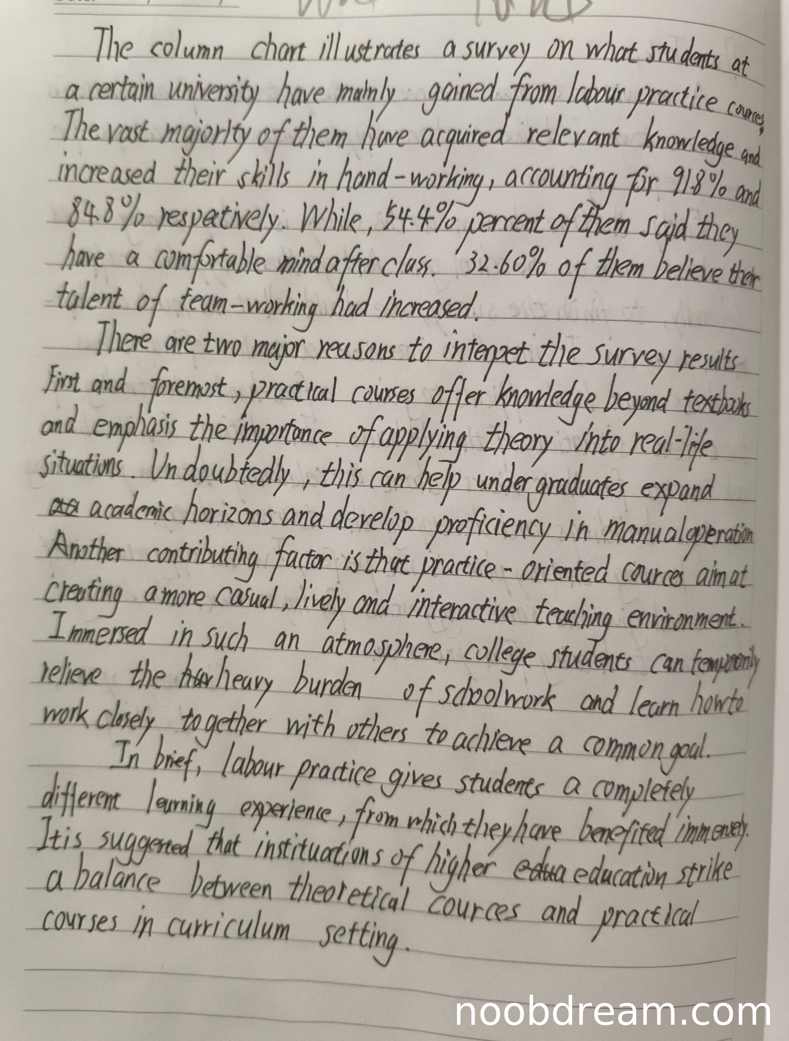 理由:语言表达整体流畅,使用了较丰富的词汇和语法结构,如"strike a balance"、"practice-oriented"等。但存在少量表达不够地道的现象,如"comfortable mind"应为"relaxed"或"refreshed","talent of team-working"应为"teamwork skills"。衔接手法运用恰当,层次清晰。