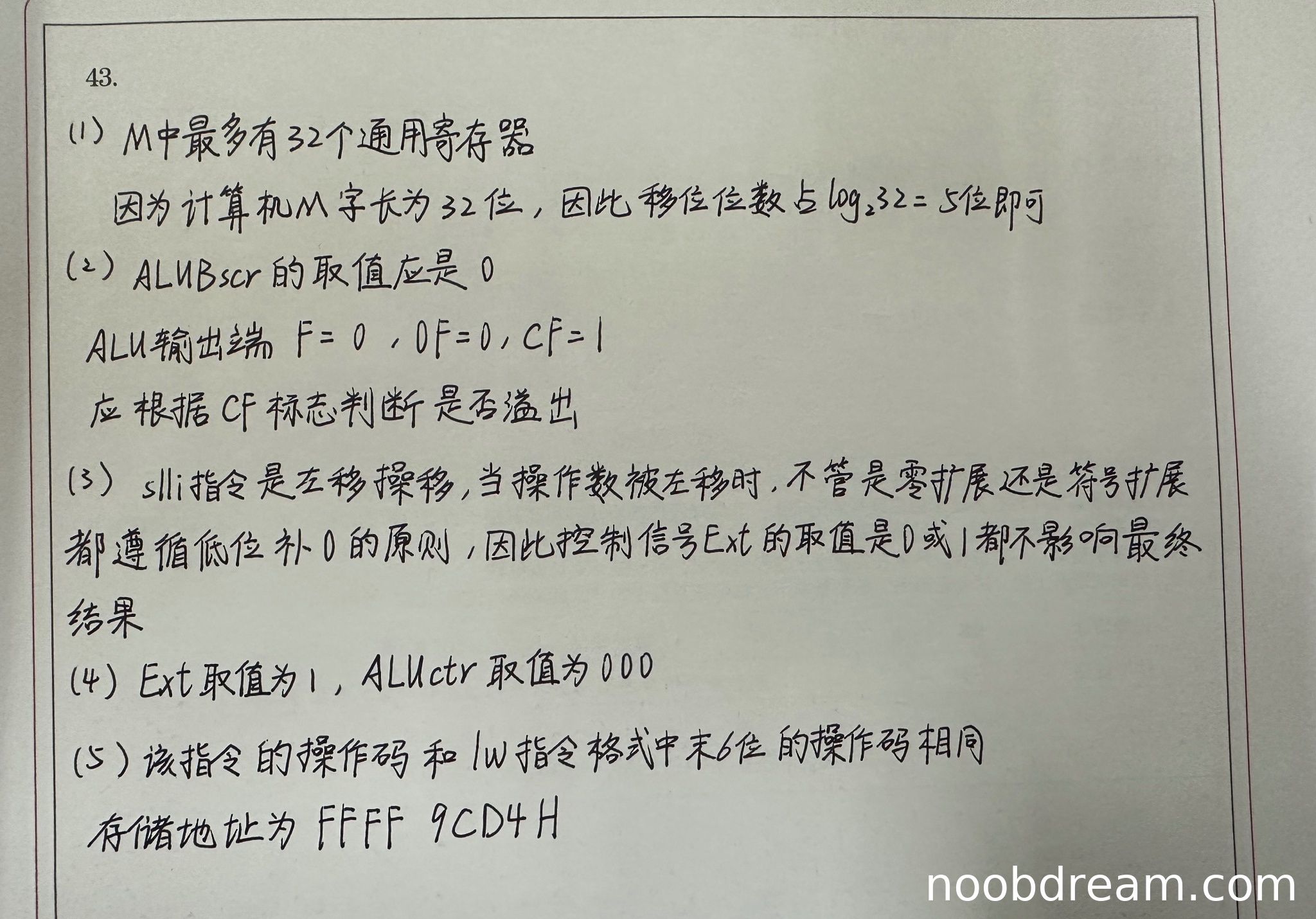 学生回答“slli指令是左移操作,不管是零扩展还是符号扩展都遵循低位补0的原则,因此控制信号Ext的取值是0或1都不影响最终结果”正确,因为立即数高7位为0,扩展后高位都是0。两次识别结果均正确,得2分。