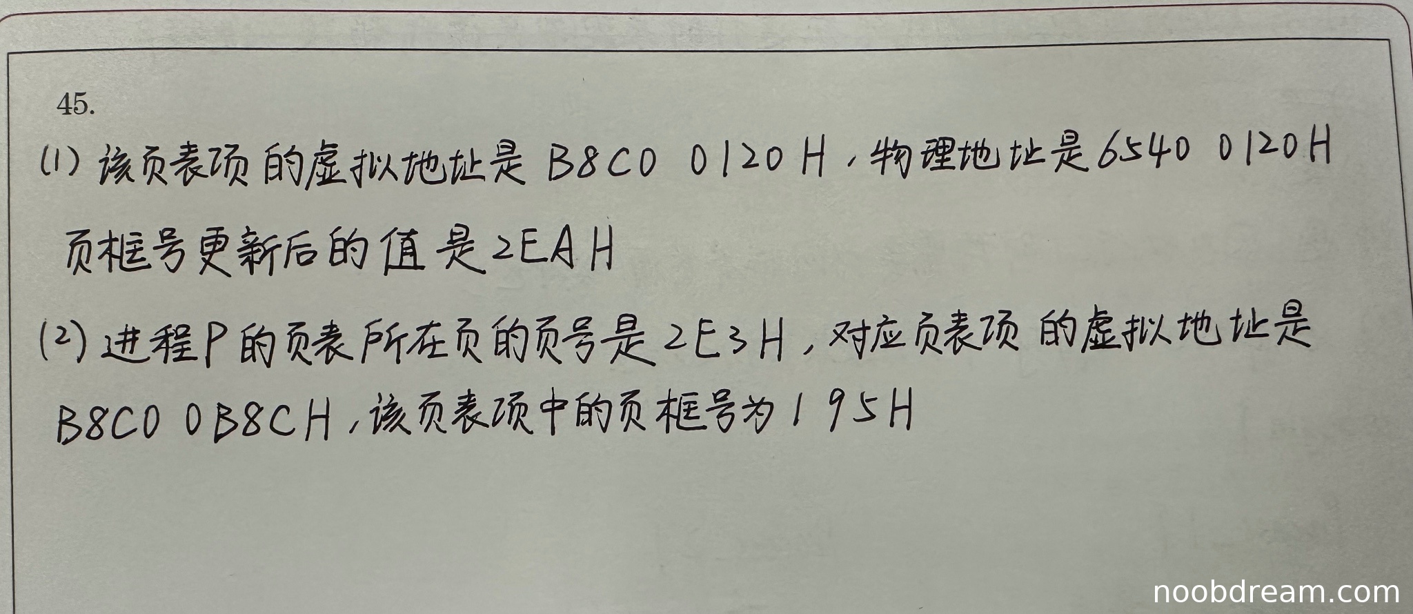学生答案中给出的页号2E3H、页表项虚拟地址B8C0 0B8CH和页框号195H与标准答案完全一致。计算过程正确,包括从页表起始虚拟地址提取页号、计算页表项偏移量以及从页表物理地址提取页框号等步骤均无误。因此得4分。