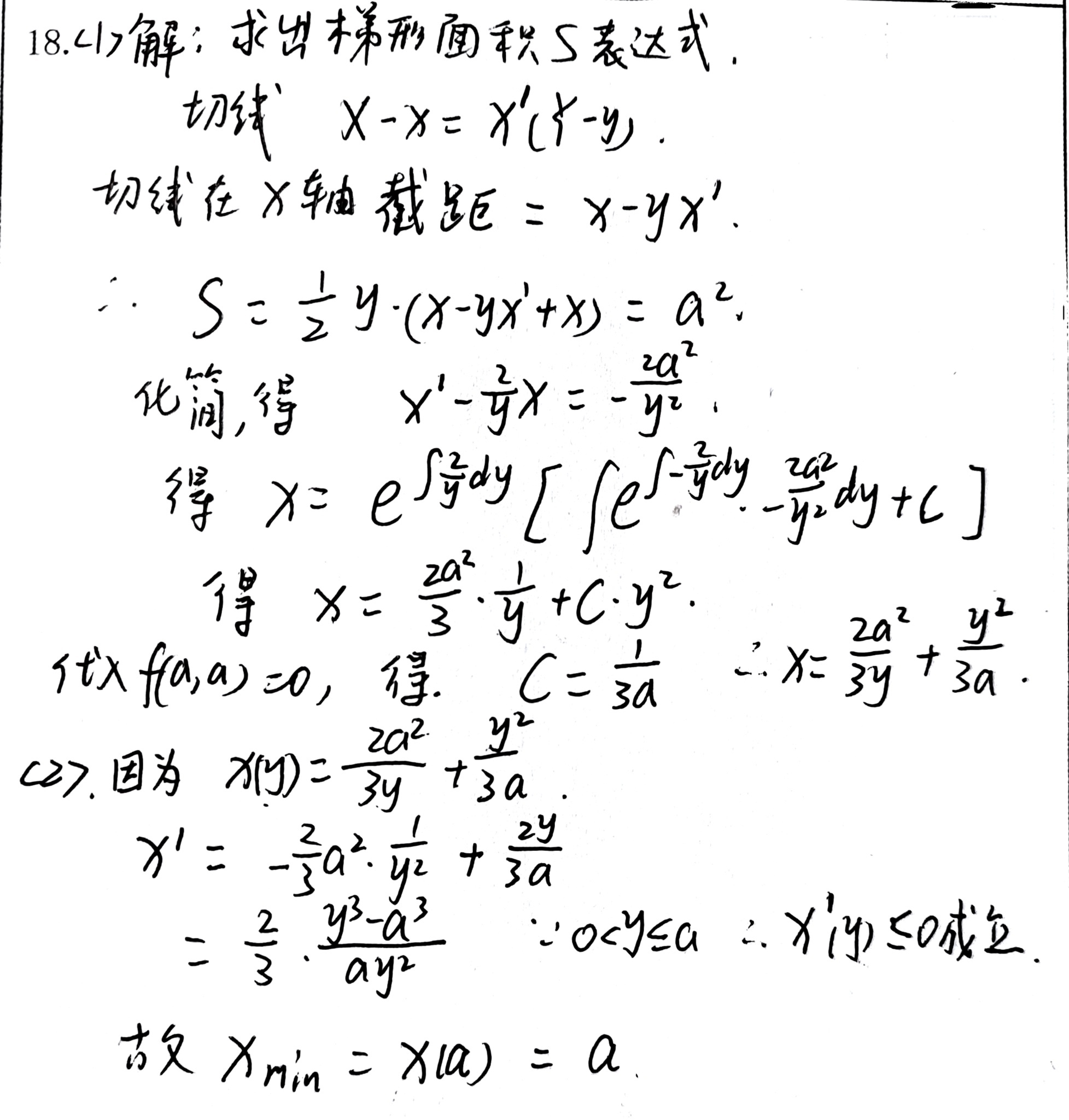 学生正确建立了切线方程,并求出了切线在X轴上的截距。梯形面积表达式正确,推导出的微分方程形式正确。解微分方程的过程基本正确,得到了通解形式。利用条件f(a,a)=0确定了常数C,最终得到了正确的曲线方程x=2a²/(3y)+y²/(3a)。整个过程逻辑清晰,计算正确。得6分。