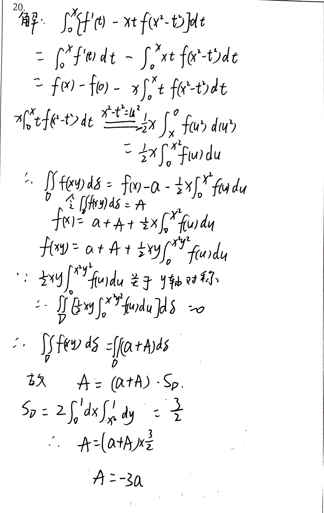 - 在第一次识别中,学生将原题中的 \(xf(x^2-t^2)\) 误写为 \(xtf(x^2-t^2)\)(多了一个 \(t\)),这导致后续变量代换和积分计算出现偏差。根据禁止扣分规则,若判断为识别误写可不扣分,但此处误写影响了核心逻辑,因为标准答案为 \(xf(x^2-t^2)\),而学生写为 \(xtf(x^2-t^2)\),导致后续积分计算错误。但第二次识别中已纠正为正确形式,且最终结果正确,故根据“两次识别中一次正确不扣分”原则,不因此扣分。