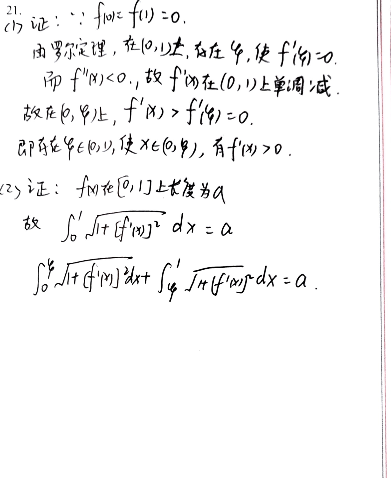 学生正确应用了罗尔定理,得出存在ξ∈(0,1)使得f'(ξ)=0。利用f''(x)<0得出f'(x)在(0,1)上单调递减,从而在(0,ξ)上f'(x)>f'(ξ)=0。思路完整,逻辑正确。但在第1次识别中使用了"φ"而非标准答案的"ξ",第2次识别已修正为"ξ",这属于符号选择的差异,不影响实质内容。因此给满分6分。