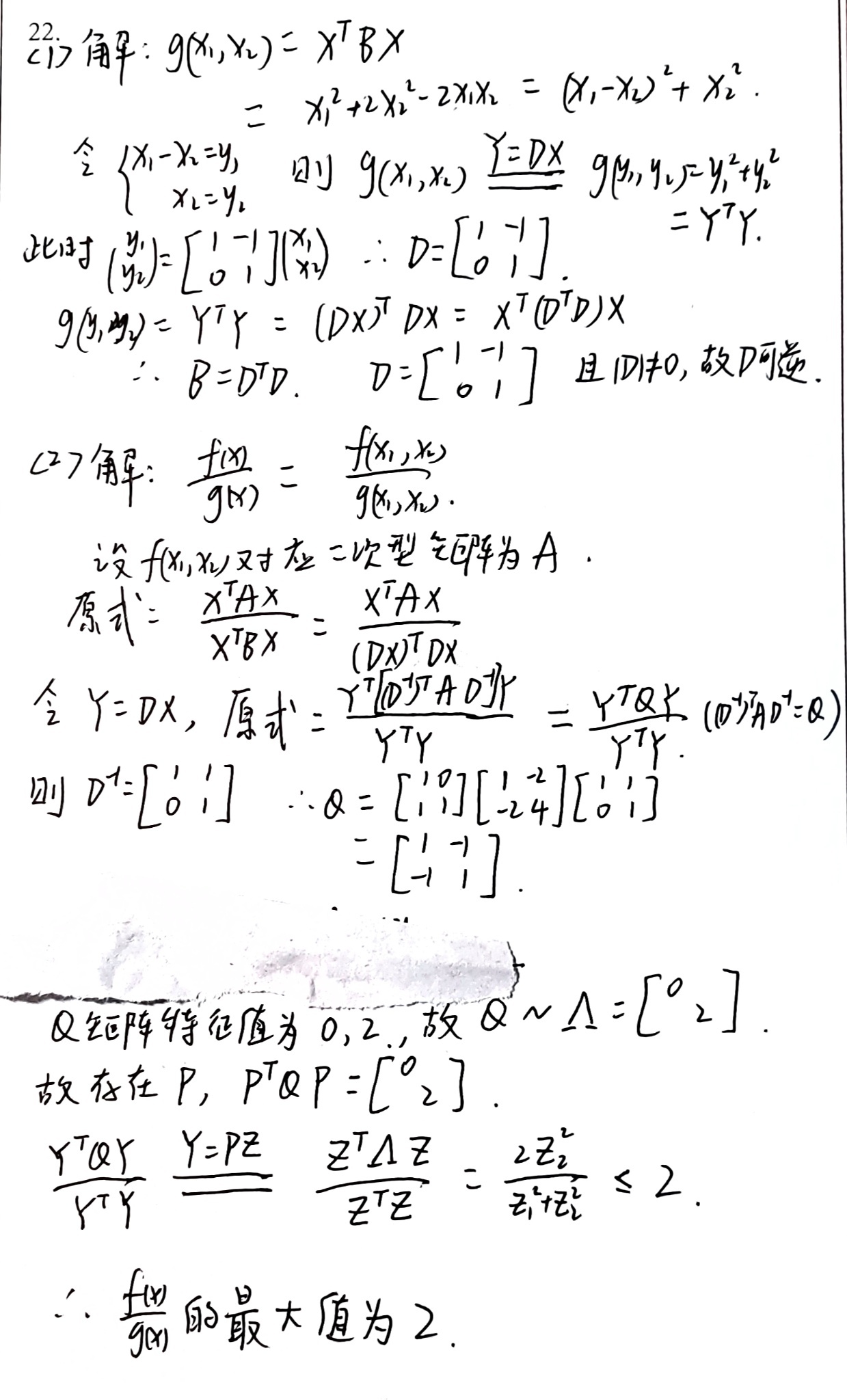 - 正确推导出B=DᵀD,并验证D可逆(|D|=1≠0)