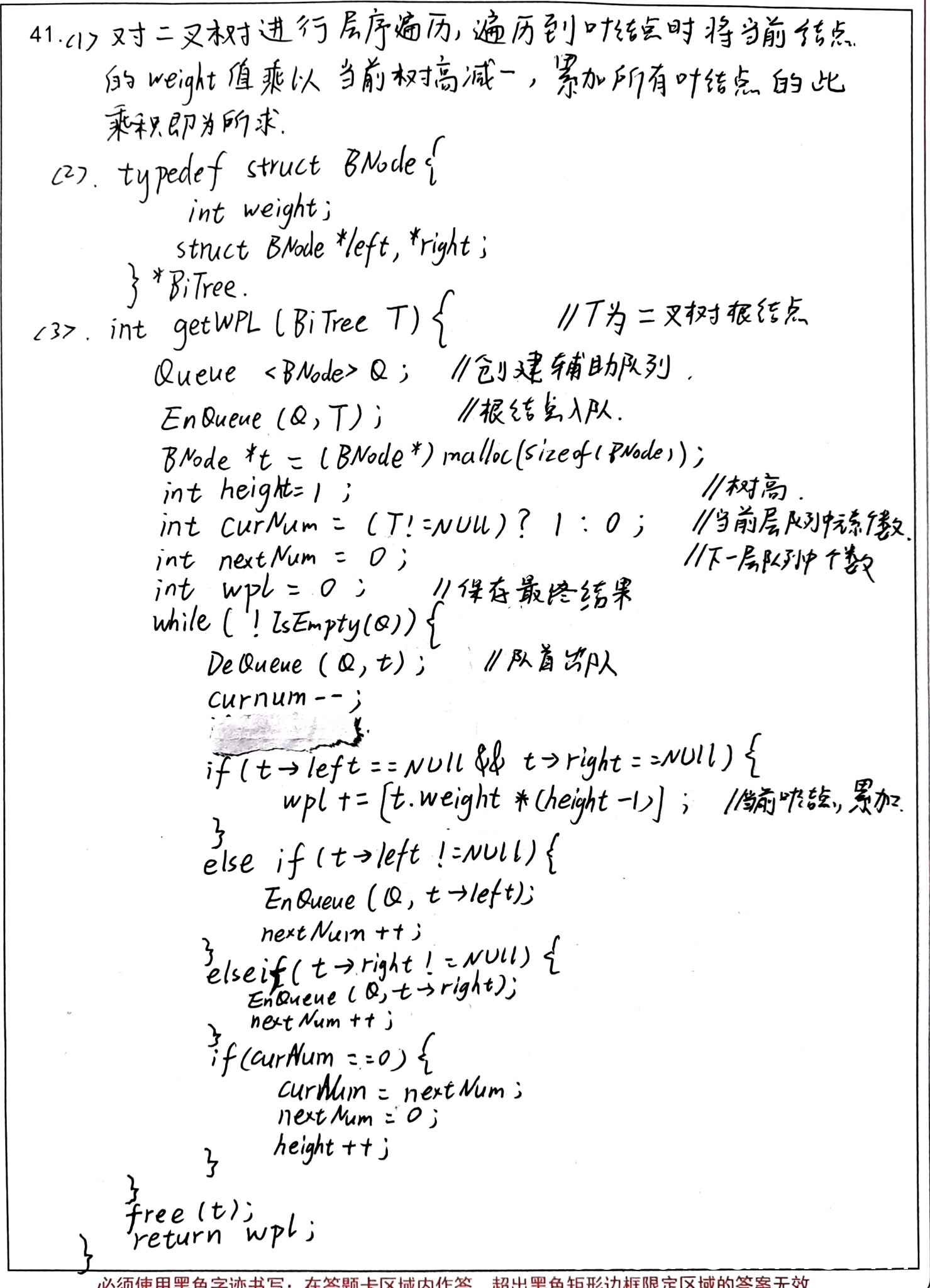 学生答案给出了基于层次遍历的设计思想,正确描述了遍历到叶结点时累加权值与路径长度乘积的过程。虽然描述中"树高减一"的表述不够精确(应该是深度,根节点深度为0),但基本思想正确。得3分。