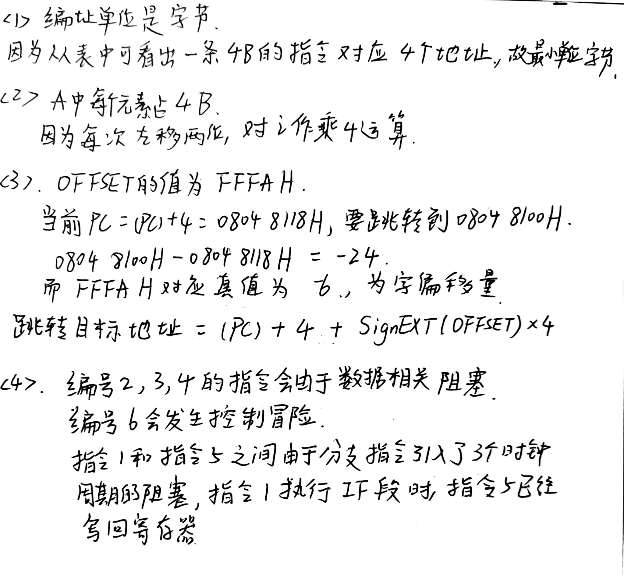 学生正确给出OFFSET值为FFFAH(补码值为-6),并正确计算跳转目标地址公式为(PC)+4+OFFSET×4。但在解释中写"FFFAH对应真值为6"(第一次识别)有误,应为-6;第二次识别已修正为-6。由于第二次识别正确,且核心计算和公式正确,不扣分。得3分。