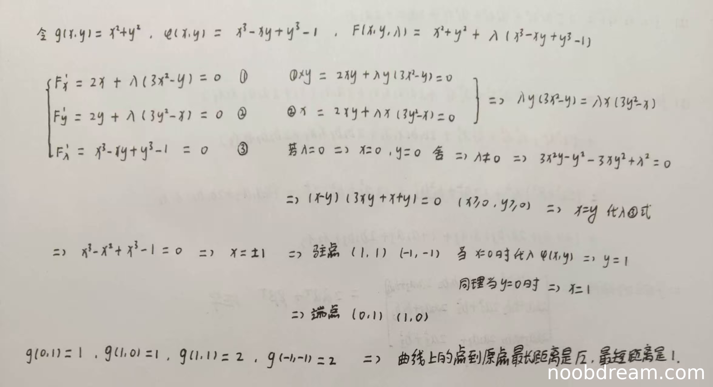 学生正确构建了拉格朗日函数,并求解了偏导方程组。在求解过程中,通过①×y和②×x相减得到λ(y(3x²-y)-x(3y²-x))=0,进而推导出(x-y)(3xy+x+y)=0。学生正确排除了λ=0和x+y+3xy=0的情况,得到x=y,并代入原方程解得x=1和x=-1。但学生没有注意到题目条件x≥0,y≥0,错误地保留了(-1,-1)点。在计算端点时,正确得到了(0,1)和(1,0)点。最终计算距离时,虽然包含了无效点(-1,-1),但结论中给出的最长距离√2和最短距离1是正确的。