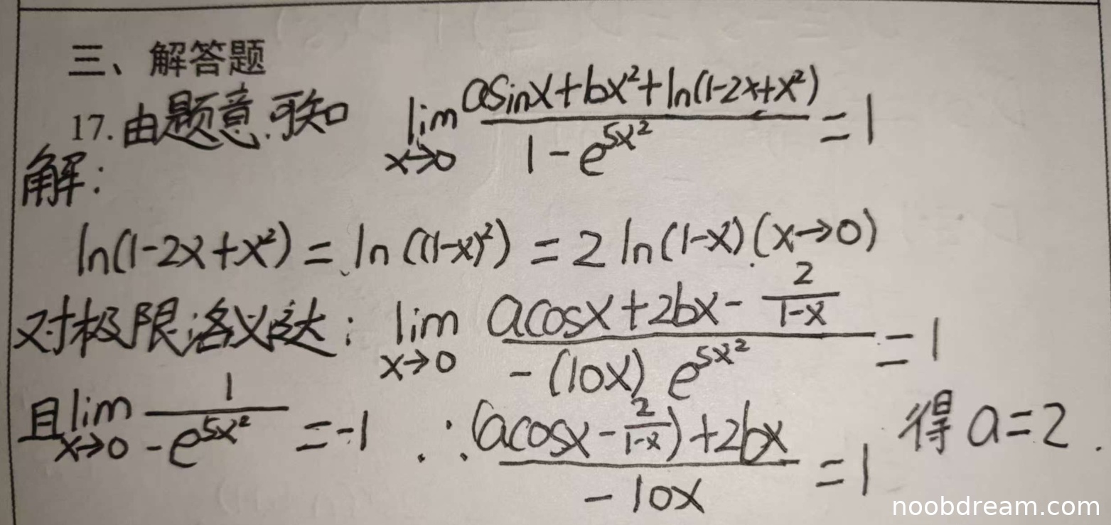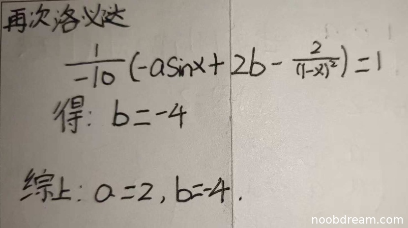 接下来,学生通过分析分子在 \(x \to 0\) 时的阶数,得出 \(a \sin x + \ln(1 - 2x + x^2)\) 必须为 \(o(x)\),否则极限不存在。由此得到: