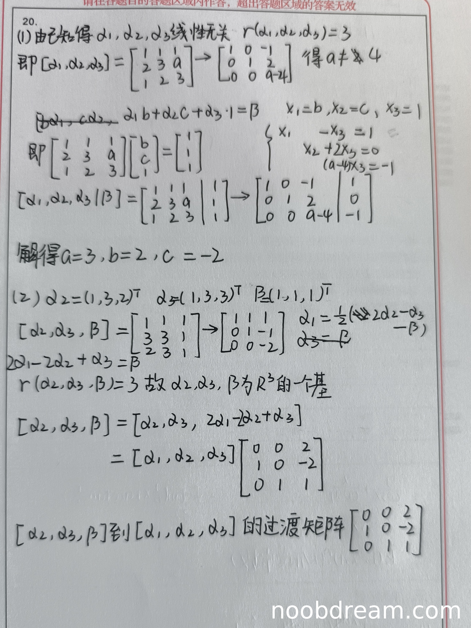 第一部分证明基:学生通过行变换得到秩为3,正确证明了α₂,α₃,β线性无关,得2分。