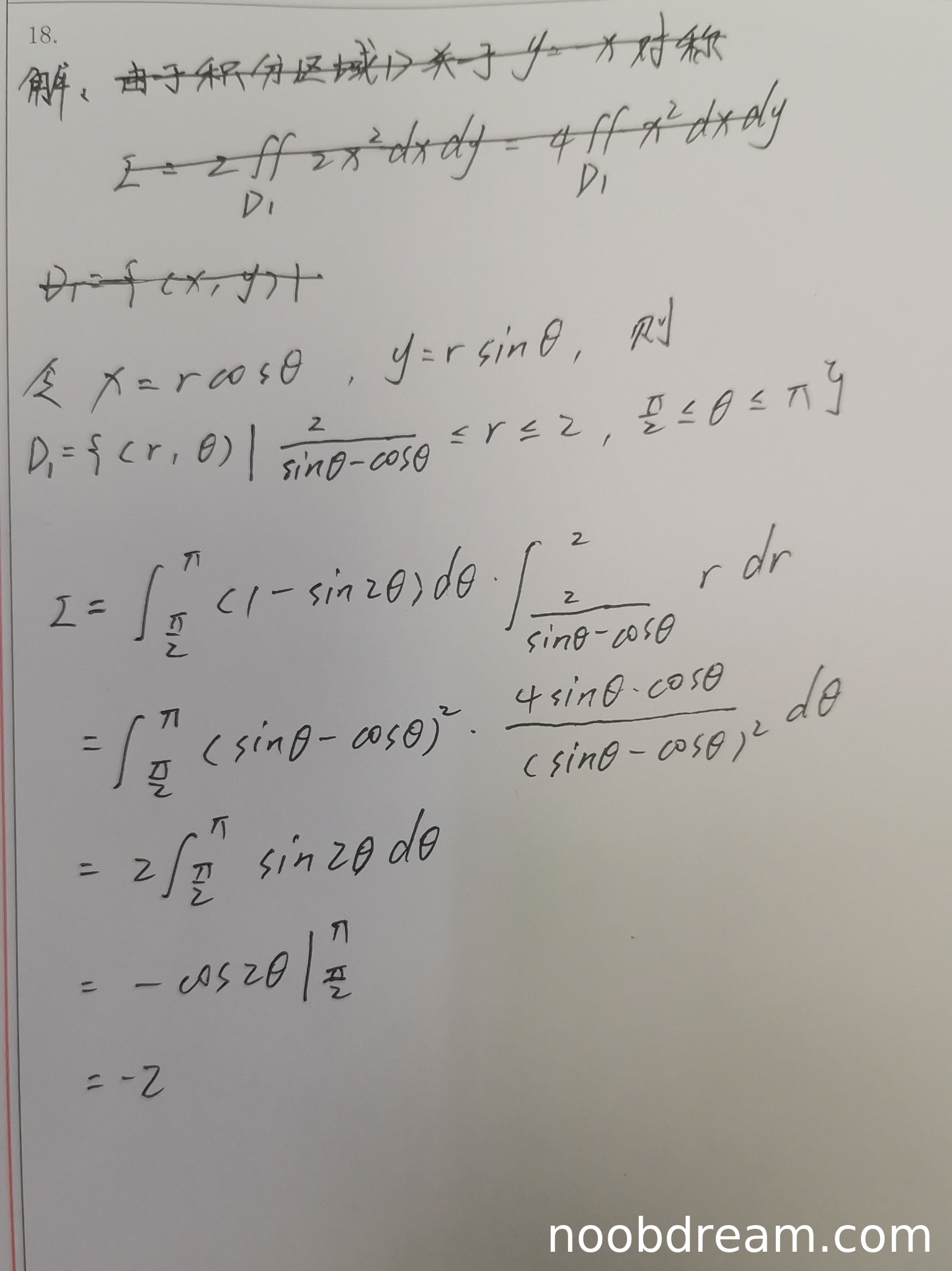 - 错误1:声称利用积分区域关于y=x对称的性质,但区域D并不具有这样的对称性。直线y=x+2和圆x²+y²=4在y=x两侧并不对称。