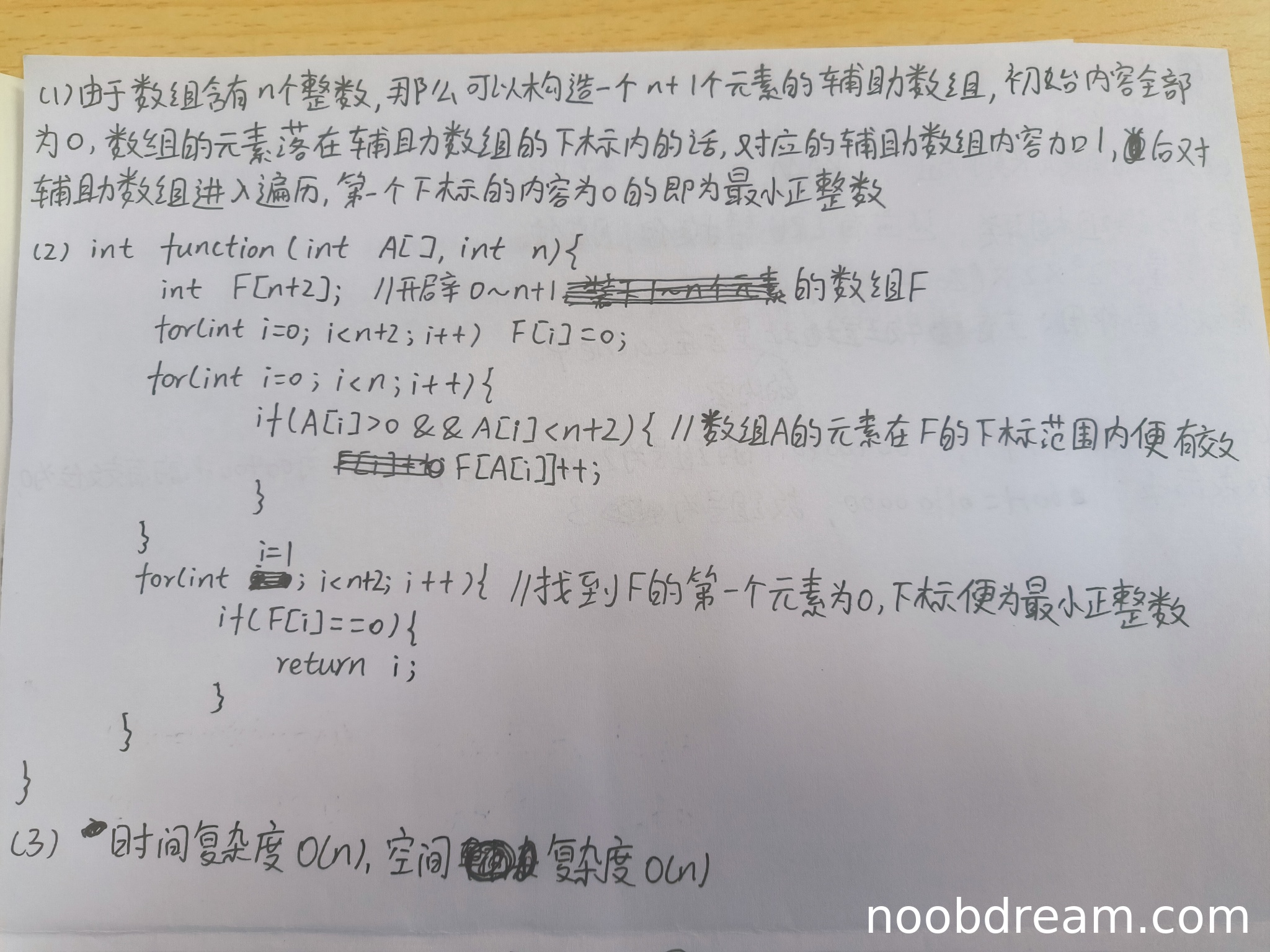 学生答案的基本设计思想是使用辅助数组标记出现过的正整数,然后遍历辅助数组找到第一个未出现的正整数。这种方法思路正确,能够解决问题,与标准答案的哈希标记法思想本质相同,只是实现方式不同。因此得3分。