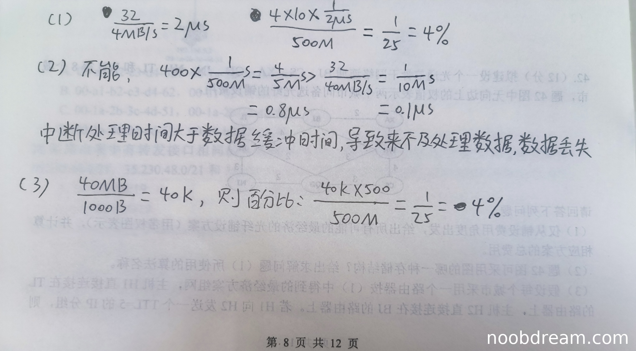 学生计算了设备A准备32位数据的时间为2μs,并得出查询间隔为2μs,这与标准答案一致。在计算CPU时间占比时,学生使用了4×10×1/(2μs) / 500M = 4%,虽然表达式写法与标准答案不同,但核心逻辑正确(考虑了每次查询执行10条指令、CPI=4、主频500MHz)。因此得4分。