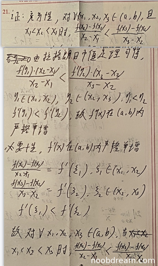 学生必要性证明思路正确。应用拉格朗日中值定理得到两个区间上的导数表达式,由于f'(x)严格单调增加且ξ₁ < ξ₂,所以f'(ξ₁) < f'(ξ₂),从而得出所需不等式。证明过程完整,逻辑清晰。虽然学生将"严格单调增加"误写为"严格单增",但根据禁止扣分规则,这属于识别问题或表述简化,不扣分。得6分。