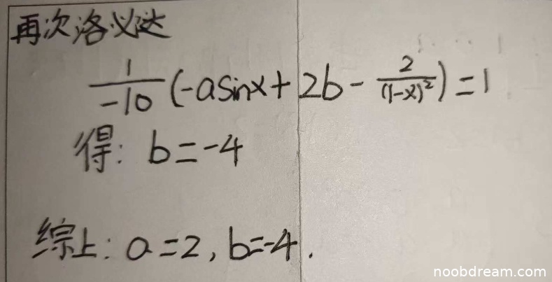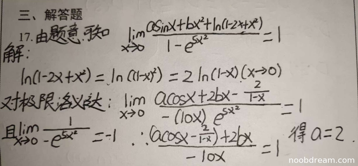 学生作答中,首先将分母 \(1 - e^{5x^2}\) 等价为 \(-5x^2\),并设极限为1,与标准答案思路一致。然后通过分子除以 \(x^2\) 的极限关系,得出 \(a\sin x + \ln(1 - 2x + x^2)\) 除以 \(x\) 的极限为0,从而求得 \(a = 2\),这一步逻辑正确。在求 \(b\) 时,学生代入 \(a = 2\) 后,对分子进行泰勒展开,正确得到 \(\sin x \sim x - \frac{x^3}{6}\),\(\ln(1 - 2x + x^2) = \ln((1-x)^2) = 2\ln(1-x) \sim -2x - x^2\),合并后分子为 \(2x - \frac{x^3}{3} - 2x - x^2 + bx^2 = (b-1)x^2 - \frac{x^3}{3}\),除以 \(-5x^2\) 后极限为1,即 \(\frac{b-1}{-5} = 1\),解得 \(b = -4\),计算正确。整个过程逻辑清晰,无错误,但学生未在最后明确写出 \(a = 2, b = -4\),而是直接给出极限表达式,但根据上下文可推断结果正确。由于思路和计算均正确,且未出现逻辑错误,根据评分要求,不扣分。