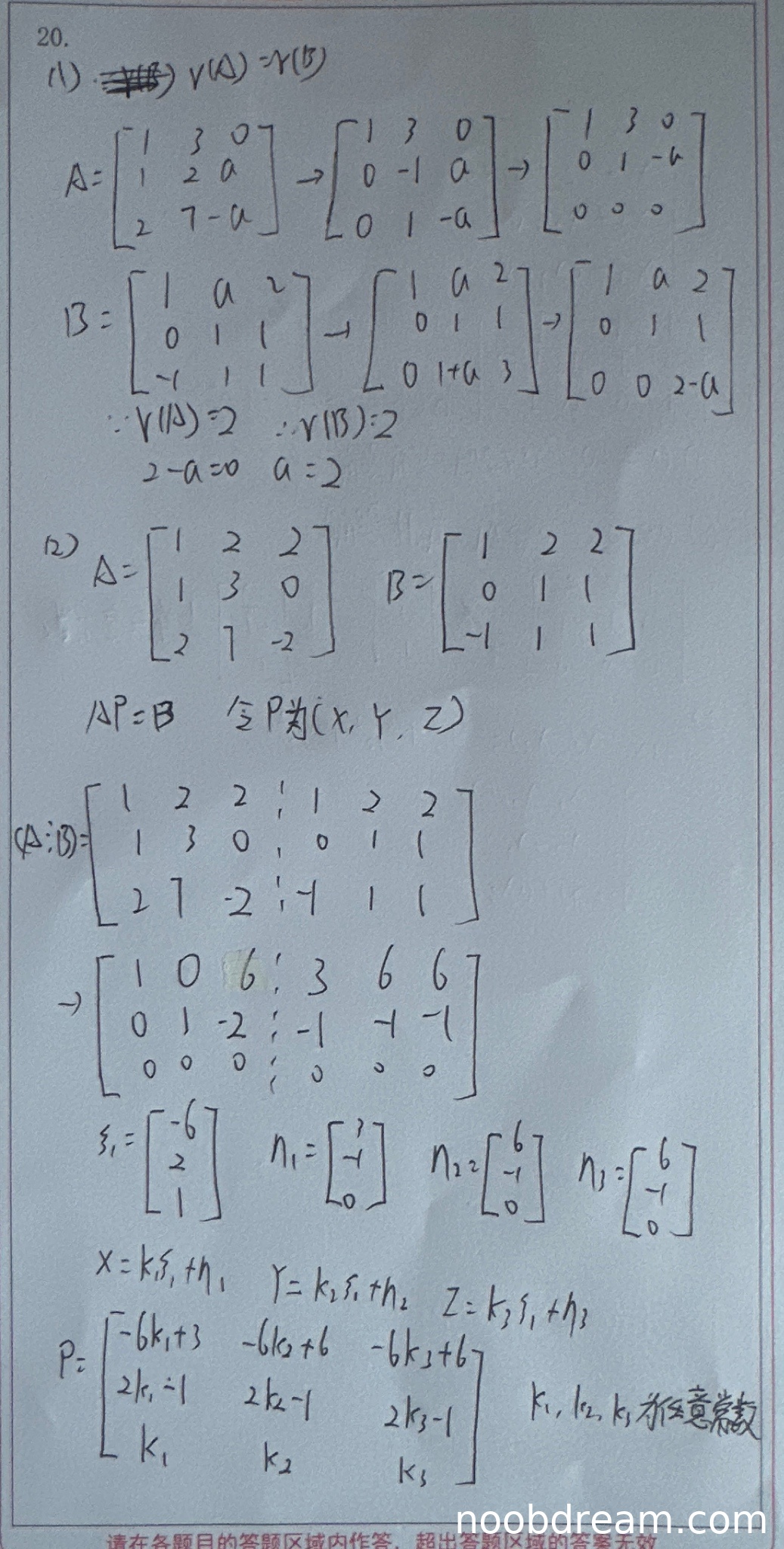 学生正确计算了矩阵A和B的秩,并通过秩相等得到a=2,思路正确,计算无误。但在矩阵A的书写中,第三行第三列元素误写为“7 - a”,而原题是“-a”,但根据上下文判断是识别或书写错误,不影响最终结果。因此不扣分。得5分。