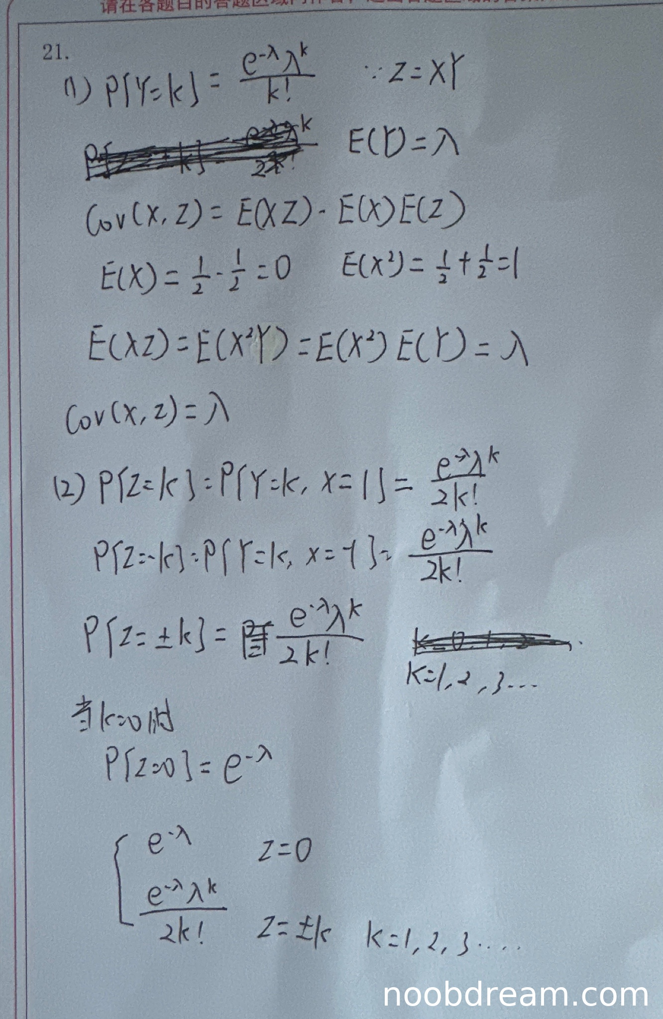 学生在求Z的概率分布时,正确考虑了X=1和X=-1两种情况,并正确写出了: - 当k>0时:P(Z=k) = (1/2)·(λ^k/k!)e^{-λ} - 当k=0时:P(Z=0) = e^{-λ} - 当k<0时:P(Z=k) = (1/2)·(λ^{-k}/(-k)!)e^{-λ} 虽然学生在最后总结时写成了"P{Z=±k} = (e^{-λ}λ^k)/(2k!)",这没有区分正负k的情况,但根据上下文可以判断这是表述不够严谨,而非实质性错误。考虑到主要思路和具体计算都正确,扣0.5分,得5分。