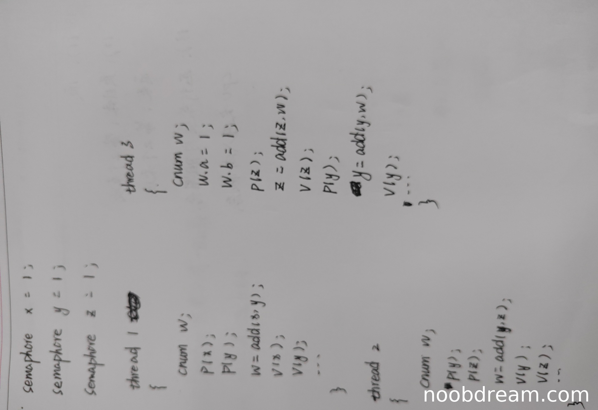 thread1中对x和y都加了锁,然后调用add(x,y)。这里存在逻辑错误:add函数的参数是cnum类型,但P(x)和P(y)操作的是信号量,参数传递的是变量x和y的值,而不是受保护的变量本身。正确的做法应该是在访问共享变量y时加锁,但不需要对x加锁,因为thread1只读x,而thread3不修改x。此外,代码中w=add(x,y)实际上传递的是信号量而不是复数变量。这个逻辑错误较为严重。得0分。